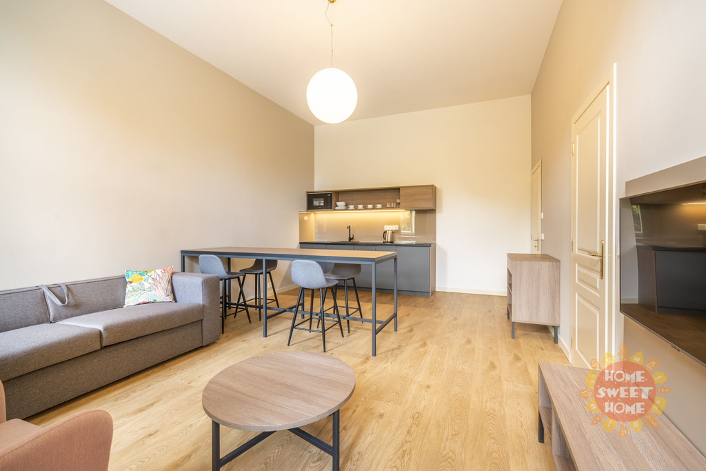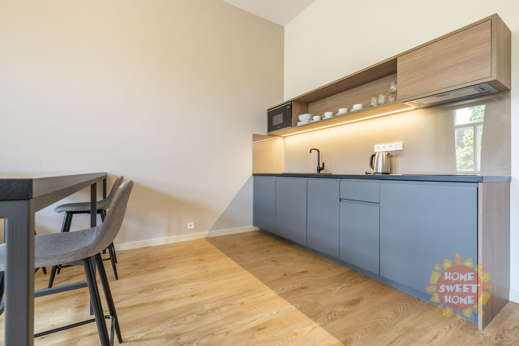 Byt tvoří obytný pokoj s plně vybavenou kuchyňskou linkou a manželskou postelí a dále koupelna se sprchovým koutem a toaletou. Součástí domu je recepce s provozem 24/7 a prádelna. V ceně poplatků jsou zahrnuty energie, vysokorychlostní Wi-Fi, 68 televizních kanálů, svoz odpadu, úklid společných prostor i recepční služby. Za příplatek je možné zajistit také doplňkové služby, jako je pravidelný úklid, výměna ložního prádla či BIO koupelnová kosmetika.