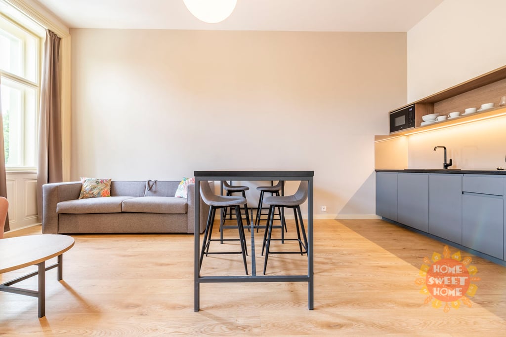 Moderně zařízený byt 2+kk po kompletní rekonstrukci o celkové výměře 43 m² s balkónem se nachází v 5. nadzemním podlaží cihlového domu s výtahem, který prošel rekonstrukcí v roce 2021. Dům je situován v ulici Opletalova, v atraktivní části Nové Město, pouhých cca 100 metrů od Václavské náměstí.