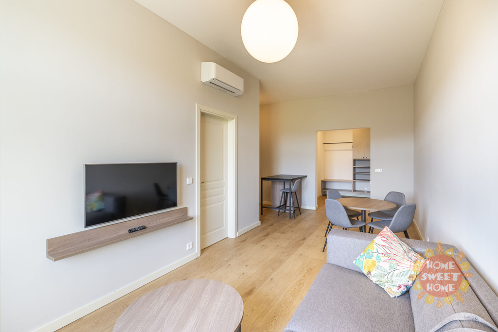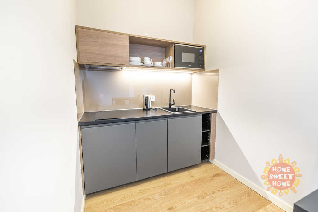 Byt sestává z prostorného obývacího pokoje s plně vybavenou kuchyňskou linkou, ložnice a koupelny se sprchovým koutem a toaletou. V bytě je pračka. Součástí domu je recepce 24/7 a prádelna. V ceně poplatků je zahrnuta energie, vysokorychlostní Wi-Fi, 68 televizních kanálů, svoz odpadu, úklid společných prostor, recepce. Možnost úklidu a výměna ložního prádla za poplatek.