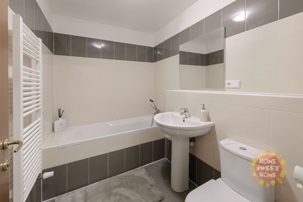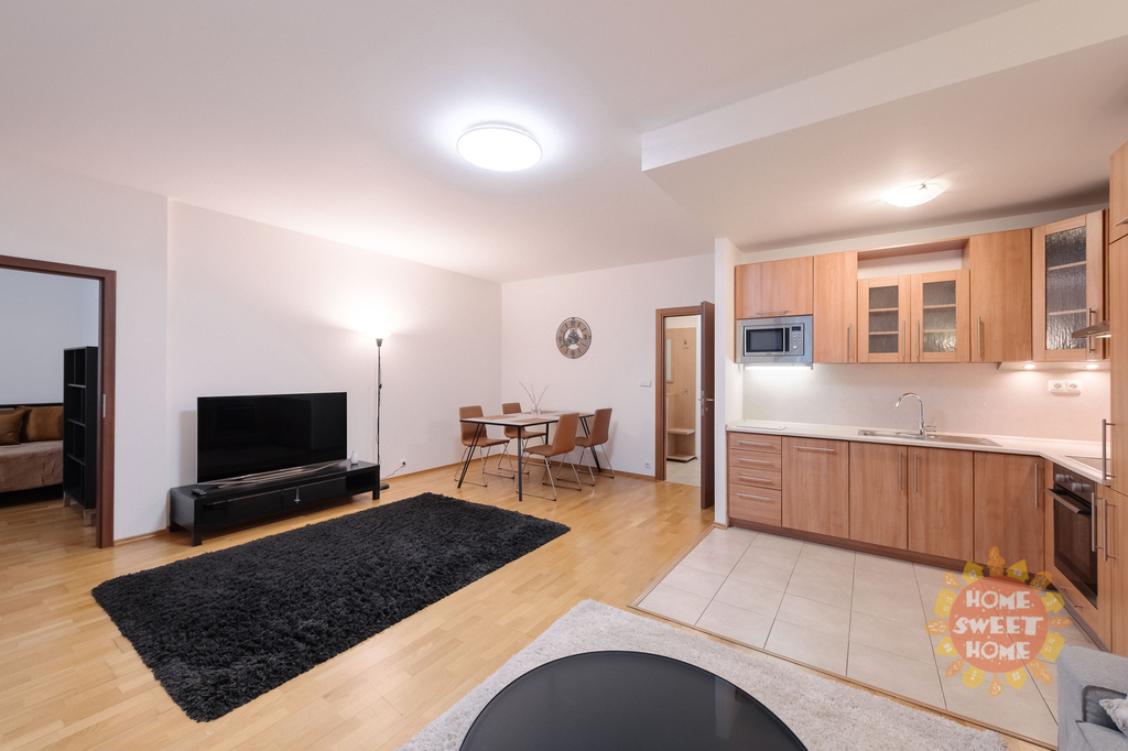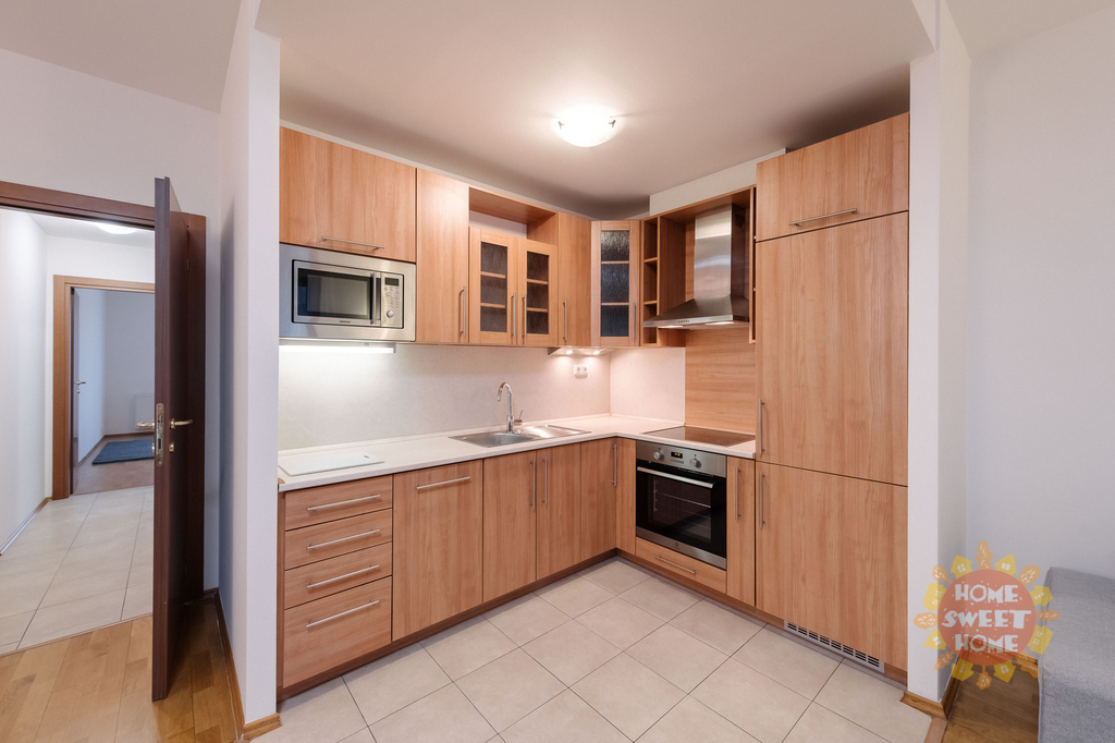 vstupní chodba se šatní skříní a botníkem (7 m2), obývací pokoj (34 m2) vybaven sedací soupravou, jídelní stůl se židlemi, konferenčním stolkem, stolek pod TV a TV (vše nové), kuchyňská linka vybavená veškerými spotřebiči (lednice, sklokeramická deska, myčka a mikrovlnka), vstup na terasu orientovanou do vnitrobloku vybavená zahradním nábytkem ložnice (16,40 m2) vybavená kvalitní pohodlnou postelí, vestavěná skříň, noční stolky s lampičkami a vstup na balkon, druhý pokoj (10 m2) vybavený postelí, skříní, pracovní stolem se židlí a křeslo, koupelna (4,20 m2) s vanou a toaletou, další toaleta (2,91 m2) odděleně a pračka. Na podlaze jsou koberce, dřevěná podlaha a dlažba. Součástí pronájmu je jedno garážové stání.
