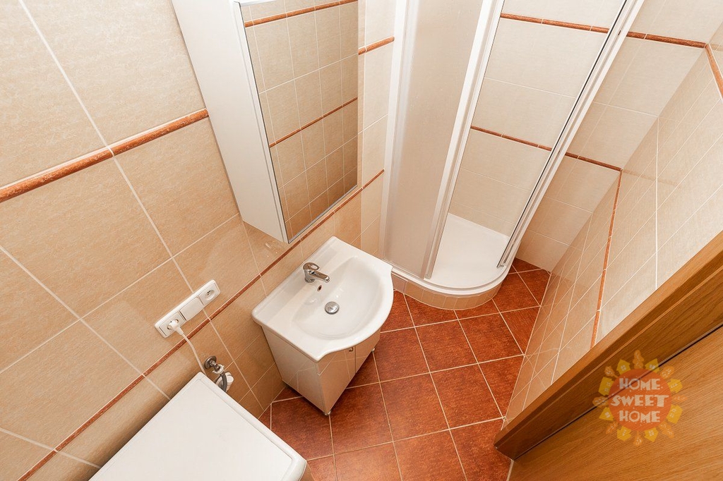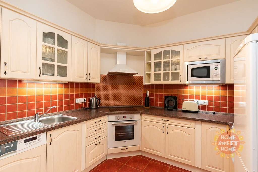 vstupní hala, dvě samostatné ložnice, obývací pokoj s kuchyňským koutem (sklokeramická deska, trouba, lednice, myčka, mikrovlnná trouba, toaster, rychlovarná konvice, atd), koupelna s vanou, pračkou a toaleta v oddělené místnosti. Další vybavení – vysavač, žehlící prkno, žehlička i úklidové prostředky. Možnost pronajmou parkovací stání za měsíční poplatek.
