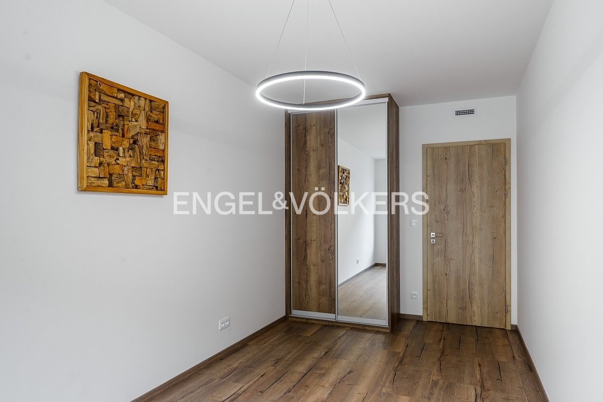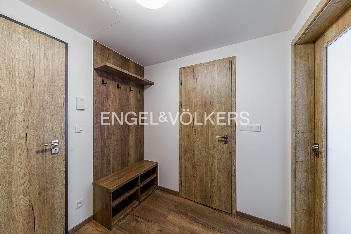 Dispozice sestává ze vstupní chodby, ložnice, koupelny s vanou a obývacího pokoje s kuchyňským koutem a vstupem na balkon. Dostatek úložného prostoru zajišťují vestavěné skříně a technická místnost/komora vybavená o pračku a sušičku. Také kuchyně je velmi hezky truhlářsky zpracována a nabízí dodatečný úložný prostor.