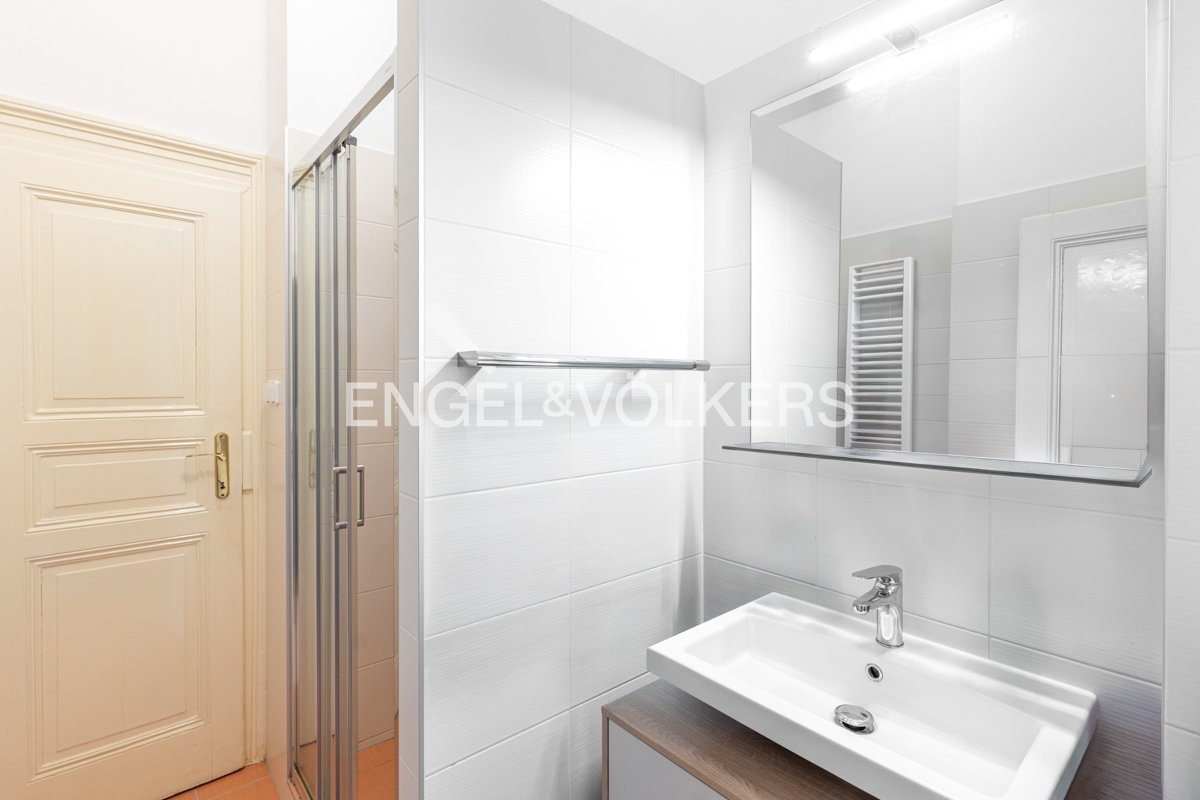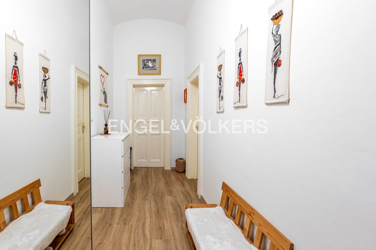 Interiér si zachoval řadu původních prvků, jako jsou vysoké stropy, špaletová okna s dvojskly nebo typické dvoukřídlé dveře, které dodávají bytu vzdušnost a příjemnou atmosféru. Jednotka prošla rekonstrukcí v roce 2019, podlahy jsou vinylové a vytápění zajišťuje elektrický kotel. PENB D, měsíční náklady se pohybují kolem 4 000 Kč. Společné prostory domu jsou dobře udržované, zaujmou i krásnými malbami na stropech. K dispozici je také výtah. Dům má zateplenou střechu, fasáda prošla v posledních 10 letech renovací.