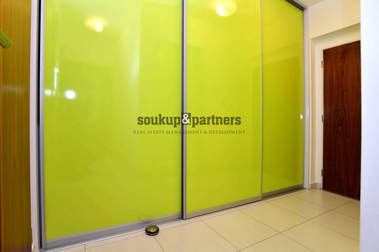 Obývací pokoj disponuje samostatným balkonem o výměře 5,3 m2 a kuchyňským koutem, který je vybaven spotřebiči - lednicí s mrazákem, indukční deskou, horkovzdušnou troubou, myčkou, mikrovlnnou troubou a digestoří. Ložnice je vybavena vestavěnou skříní a je zde přímý vstup do lodžie (8,4 m2). V koupelně je zvolena vana s pevnostním sklem, dále je zde WC, umyvadlo se skříňkou a zrcadlo, vstupní chodba má další úložné prostory a technická místnost připojení na pračku a sušičku, dále byt obsahuje interiérové dveře včetně obložení Sapelli, vstupní bezpečnostní dveře zn. NEXT, na podlahách dlažba a krytina Barkotex (laminát). Byt je také vybaven klimatizací.