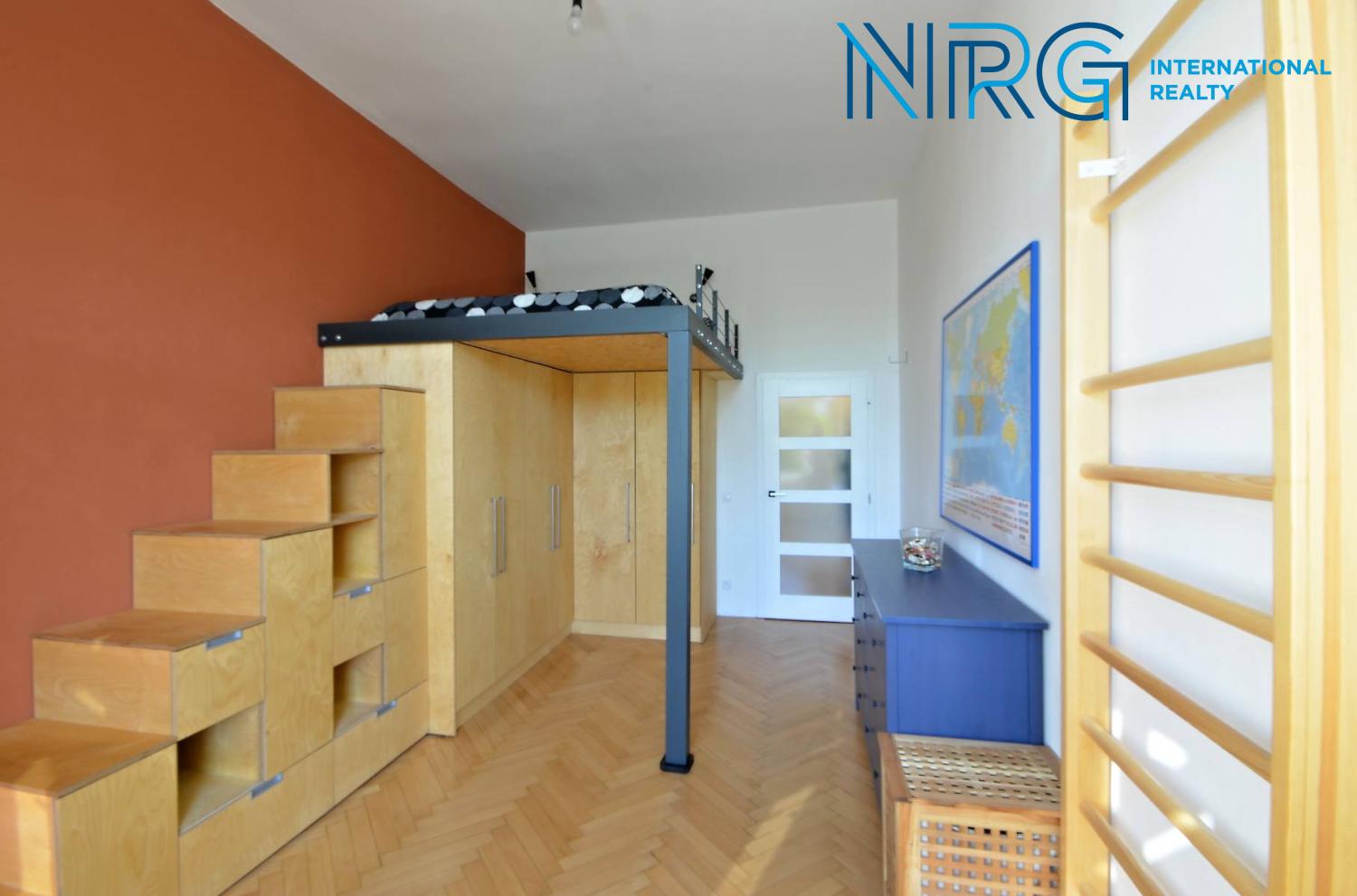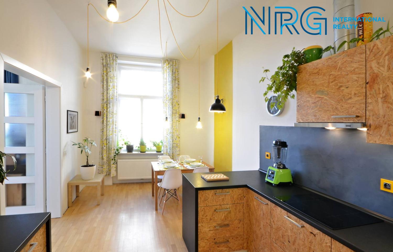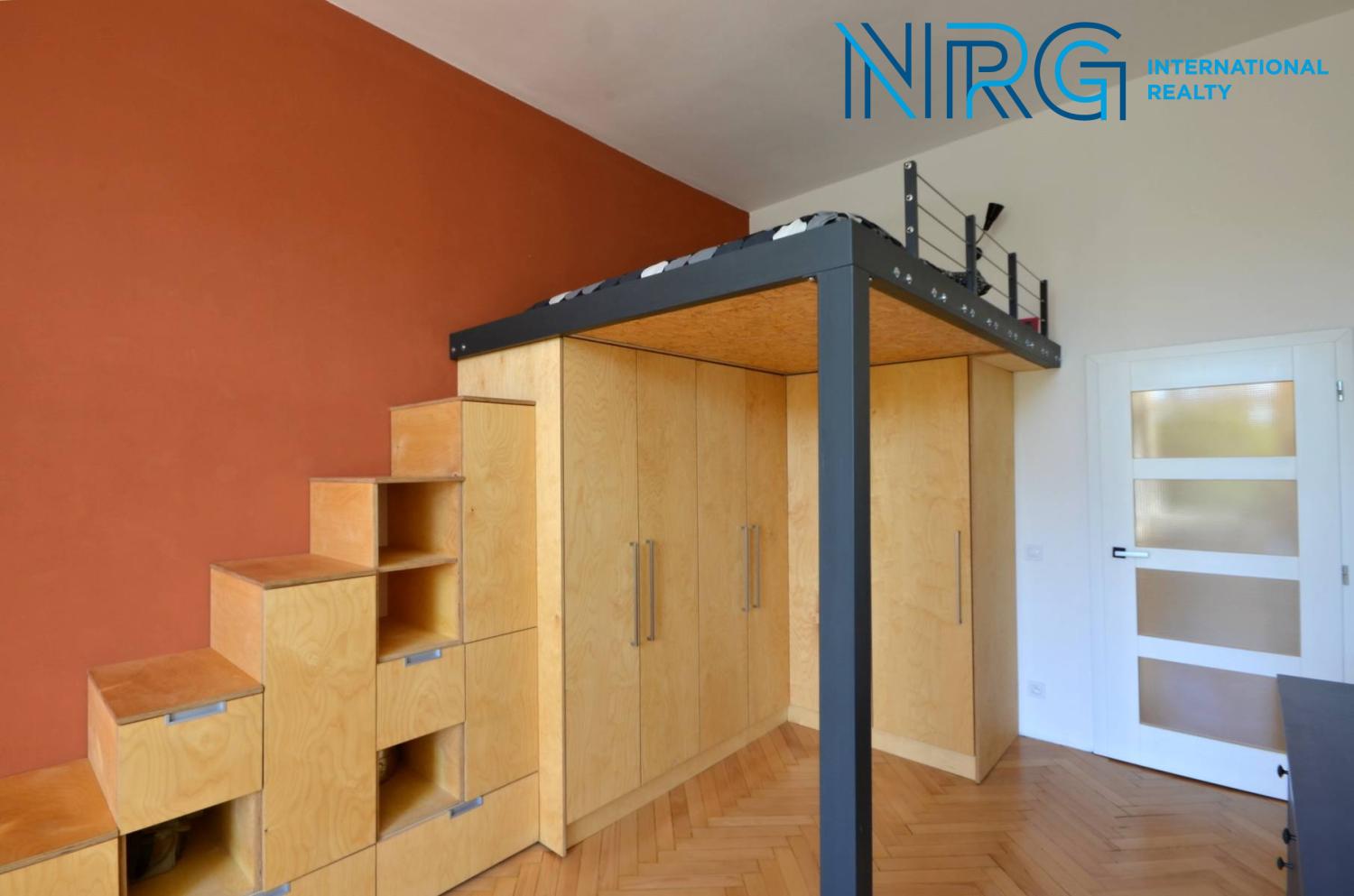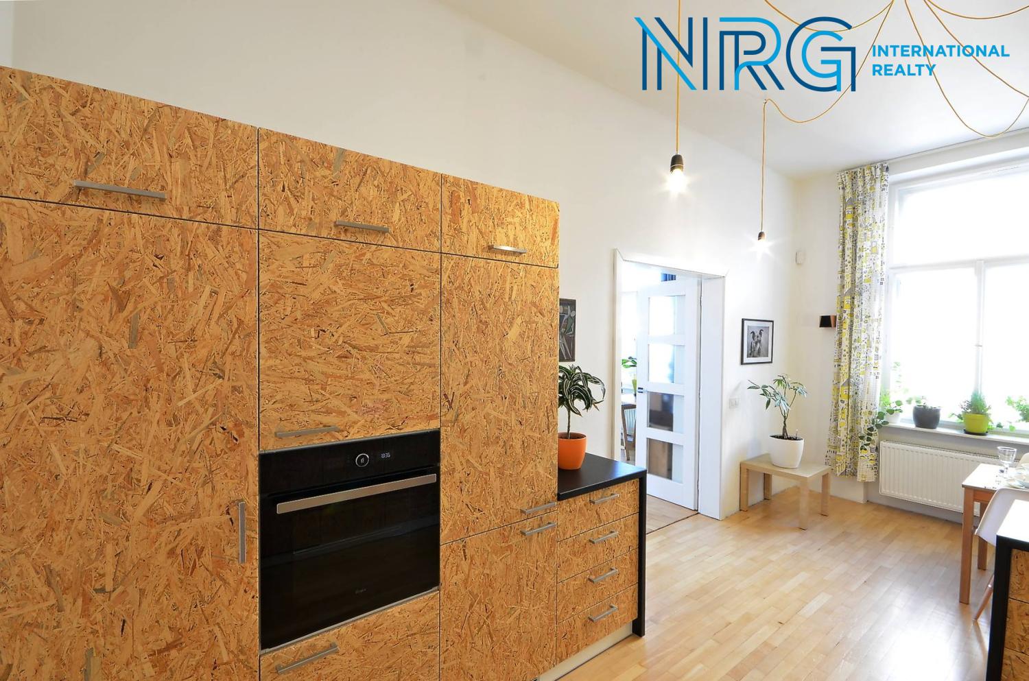 Moderní světlý byt s designovými prvky po pěkné rekonstrukci. Hlavní obývací hala je skvělé prosvětlená, atmosféru dodávají obývací hale velká okna, vysoké stropy a na zakázku vyhotovené dvoukřídlé dveře z masivu. Dále je zde ložnice, kde se velmi chytře pracovalo s prostorem. Postel v patře a vestavěné skříně v prostorech schodů zůstanou v bytě. Je zde velká kuchyň s jídelnou. Kuchyňská linka je na zakázku dle návrhu současných majitelů. Místo standardních dveří byly použity OSB desky, ty jdou samozřejmě jednoduše vyměnit za jiný design. Kuchyňská linka zahrnuje vestavěnou lednici, mrazák, horkovzdušnou troubu, indukční varnou desku, myčku a digestoř s vývodem na střechu. Další zajímavé prvky jsou bezfalcové dveře s designovým kováním do koupelny a WC. V bytě je kompletní a kvalitní rozvod elektřiny, kde v každé místnosti jsou TV i datové zásuvky s moderním designem vypínačů a zásuvek.