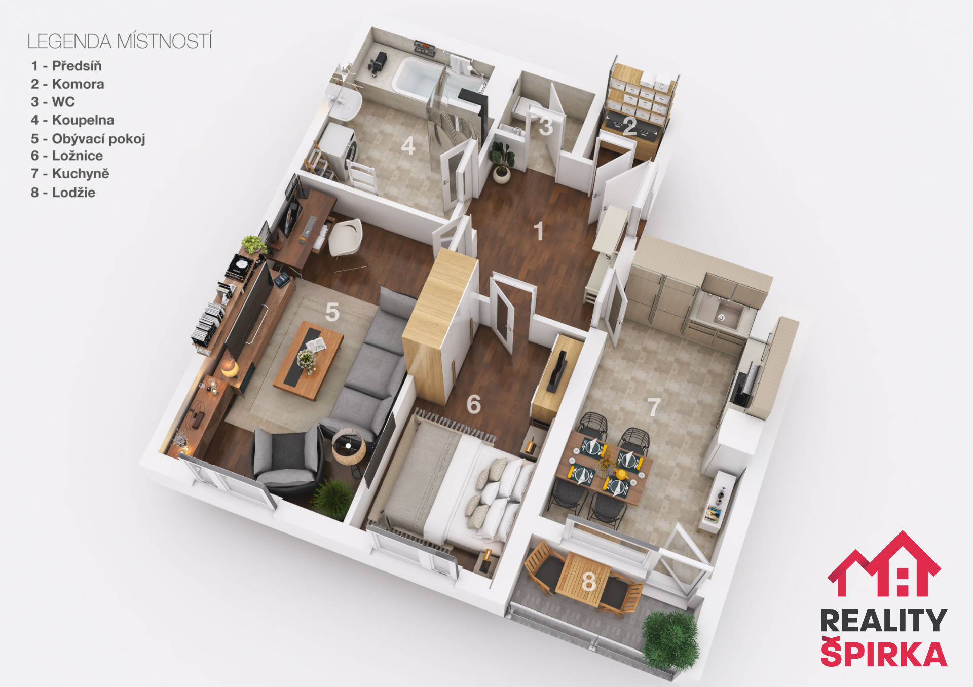 Dispozice bytu je znázorněna v prezentaci formou 3D půdorysu, kdy si dovoluji vyzdvihnout výhodu lodžie přístupnou z kuchyně a prostornou koupelnu o výměře 8,75 m2. K bytu pak náleží zděný sklep o výměře 2,5 m2.