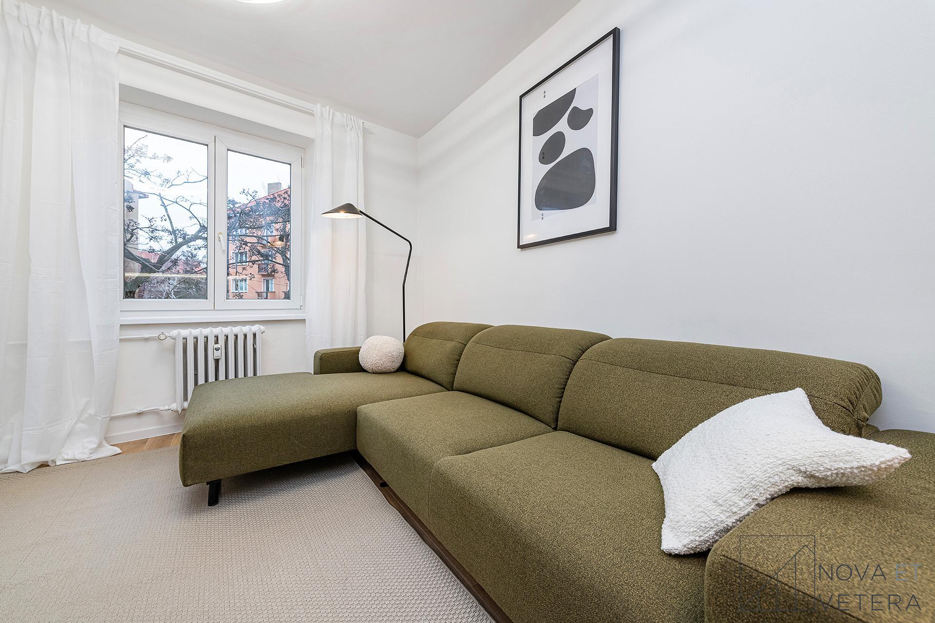 Byt aktuálně prochází kompletní a kvalitní rekonstrukcí a bude připraven k nastěhování v květnu 2026. Rekonstrukce zahrnuje nové rozvody elektřiny, vody a odpadů, moderní dřevěné podlahy, obklady a dlažbu italské značky Marazzi a koupelnu se sanitou značky Grohe. Součástí bytu bude také nová kuchyňská linka vybavená vestavnými spotřebiči prémiové značky Bosch s prodlouženou zárukou 5 let. Díky tomu bude byt připraven k okamžitému užívání ve vysokém standardu, bez nutnosti dalších investic.