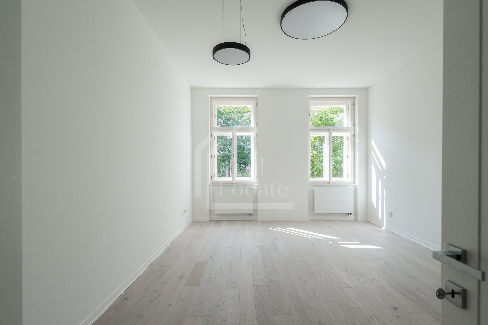 Interiér se vyznačuje vysokými stropy, velkými kastlovými okny a kvalitními dřevěnými podlahami, které dodávají bytu charakter a eleganci. Byt se nabízí nezařízený, s vysoce kvalitními koupelnovými zařizovacími předměty a prémiovými povrchy v celém prostoru.