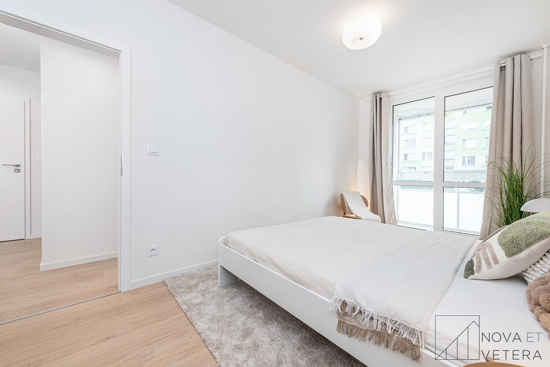 Jednotka je orientována na dvě světové strany - západ a sever. Světlý obývací pokoj disponuje vstupem na lodžii o velikosti 6 m² a s odděleným kuchyňským koutem. K dispozici jsou tři samostatné pokoje, které mohou sloužit jako ložnice, dětský pokoj, pracovna nebo pokoj pro hosty. Dva z pokojů mají vlastní vstup na lodžii, jedna o velikosti 3 m² a druhá 4,5 m². Moderní koupelna je vybavena sprchovým koutem a toaletou, druhá toaleta je samostatná. Vstupní chodba a samostatná místnost, která může sloužit jako komora nebo šatna nabízí dostatek úložného prostoru.