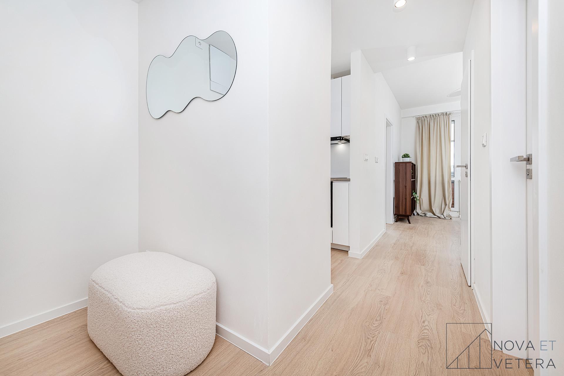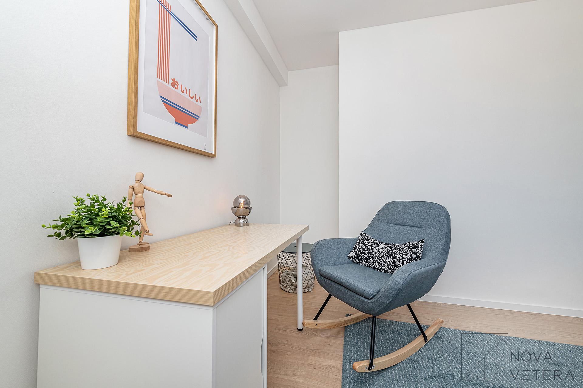 Jednotka je orientována na dvě světové strany - západ a sever. Světlý obývací pokoj disponuje vstupem na lodžii o velikosti 6 m² a s odděleným kuchyňským koutem. K dispozici jsou tři samostatné pokoje, které mohou sloužit jako ložnice, dětský pokoj, pracovna nebo pokoj pro hosty. Dva z pokojů mají vlastní vstup na lodžii, jedna o velikosti 3 m² a druhá 4,5 m². Moderní koupelna je vybavena sprchovým koutem a toaletou, druhá toaleta je samostatná. Vstupní chodba a samostatná místnost, která může sloužit jako komora nebo šatna nabízí dostatek úložného prostoru. K bytu náleží sklepní kóje o velikosti 2 m².