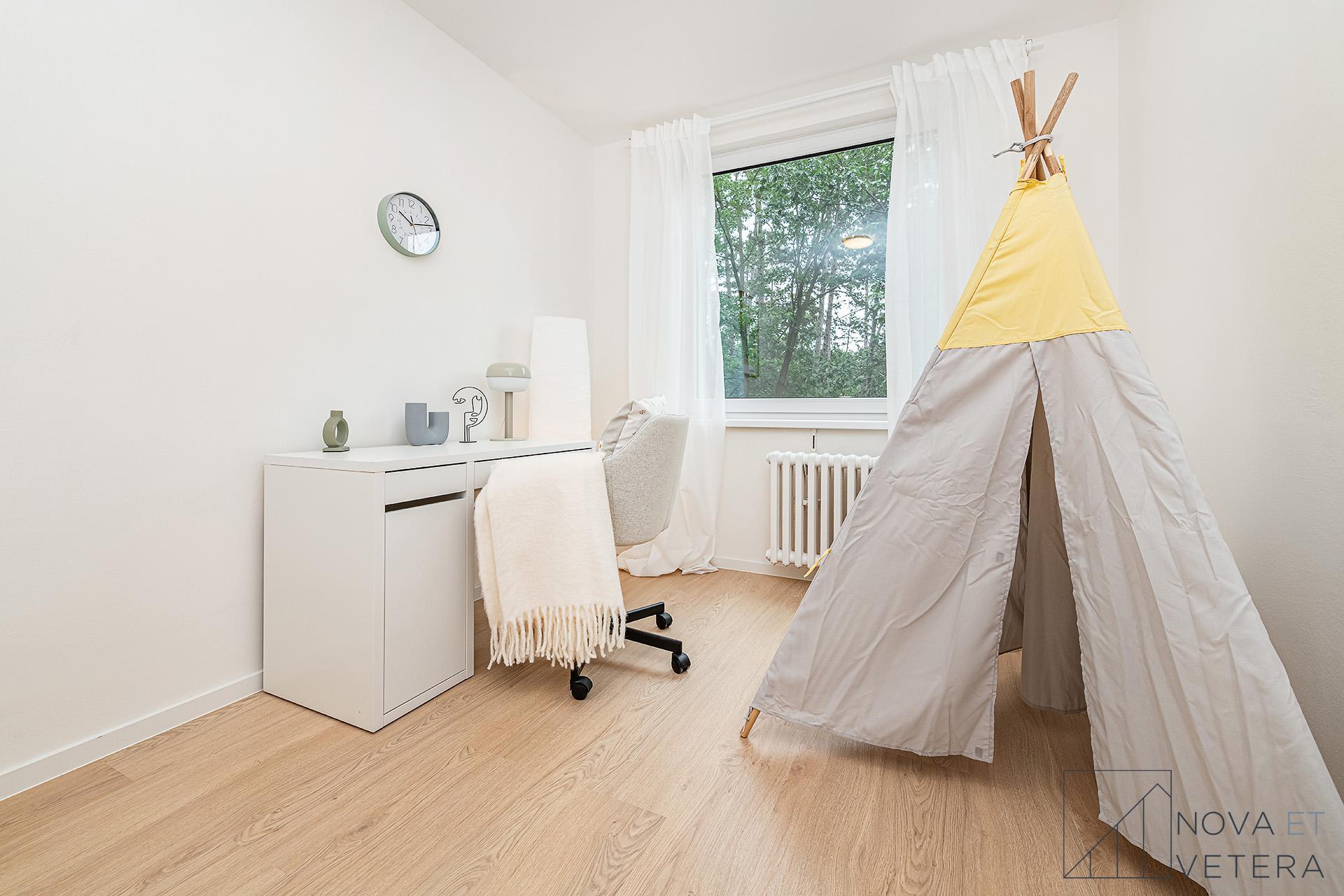 Dispozičně byt nabízí prostorný obývací pokoj s kuchyňským koutem, čtyři samostatné pokoje vhodné jako ložnice, dětské pokoje či pracovna. Hlavní ložnice má přímý vstup na balkon o velikosti 4 m². Koupelna je vybavena sprchovým koutem a toaletou, k dispozici je také další samostatná toaleta, prostorná technická místnost a vstupní chodba s možností vytvoření dostatečných úložných prostor. K bytu náleží sklepní kóje o výměře 2 m² a společná kolárna.