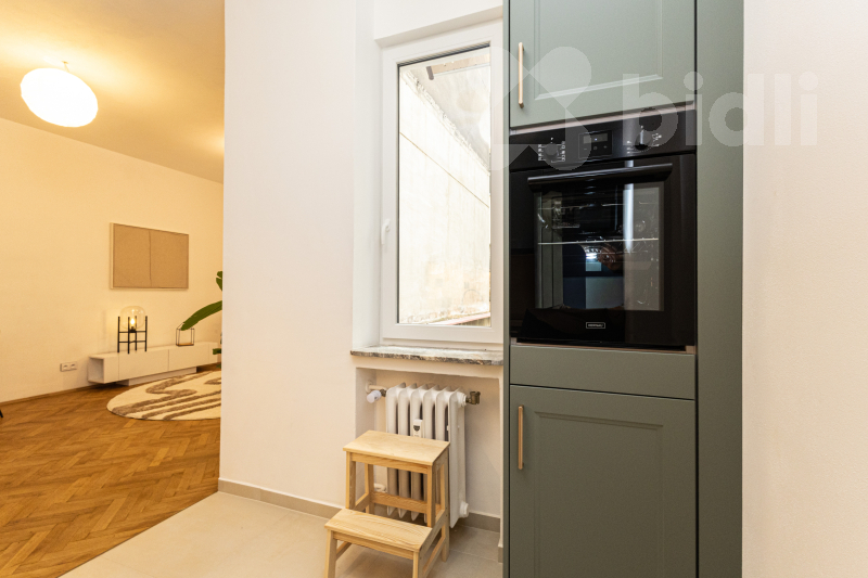 This 1-bedroom studio apartment (46 sqm) has undergone a complete renovation, including all electrical, water, and waste systems. Preserved original features add character and reflect the authentic atmosphere of Letná.