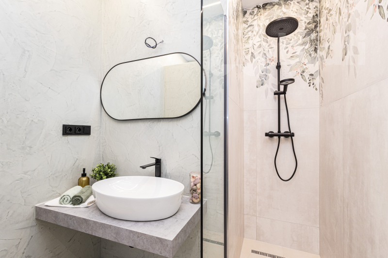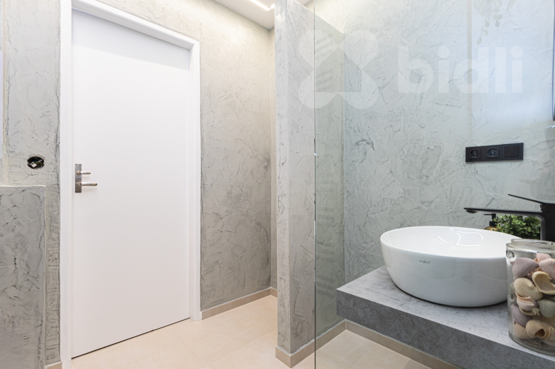 The kitchen is fully equipped with built-in appliances, including a dishwasher, cooktop, oven, and refrigerator. The bathroom combines high-quality ceramic tiles with concrete plaster finishes and includes connections for a washing machine and dryer.