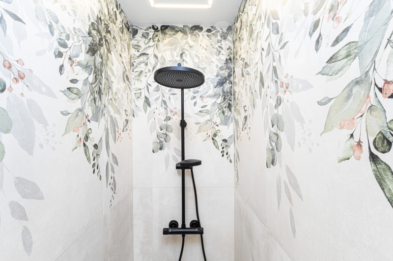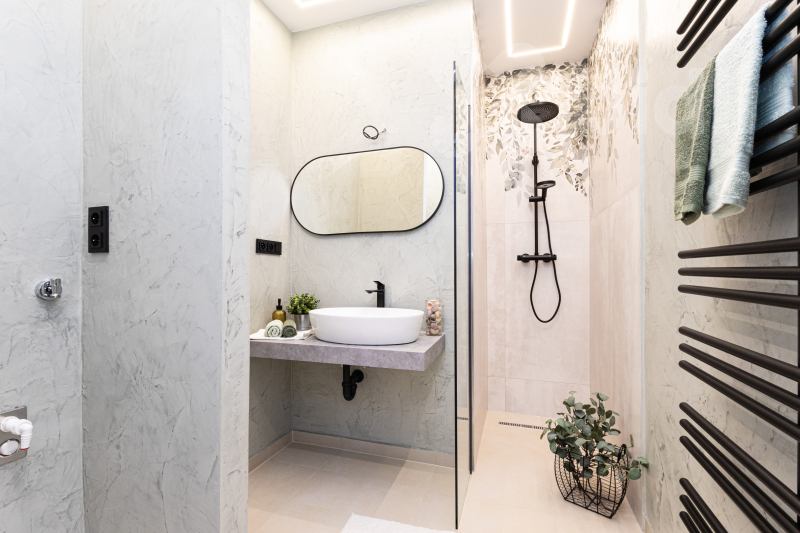 V koupelně byla kromě kvalitních keramických obkladů použita betonová stěrka. Najdeme zde přípravu pro pračku a sušičku. WC Geberit je oddělené.
