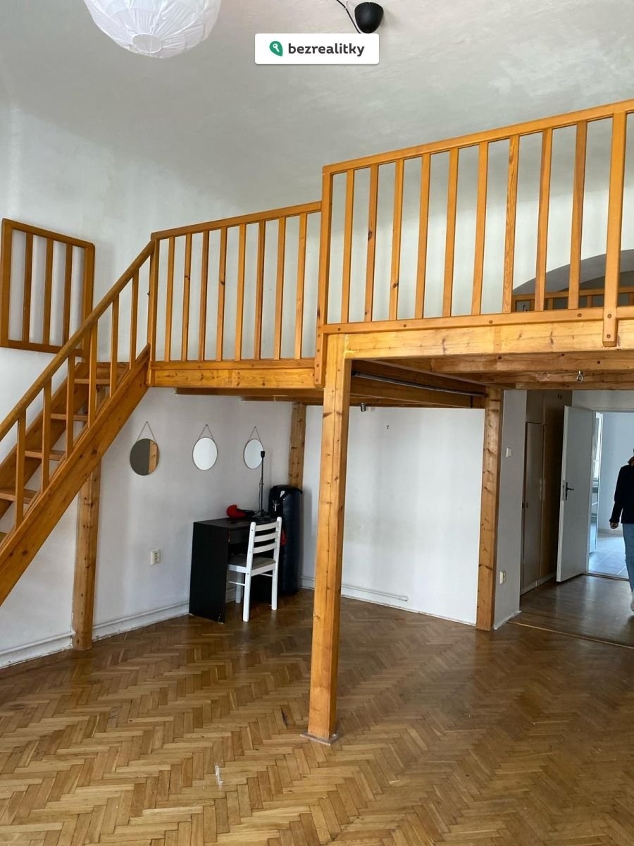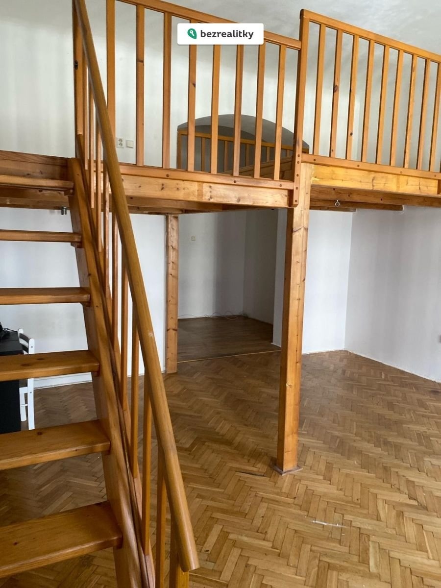 Dispozičně se jedná o dvě místnosti, kdy jedna je orientovaná do klidného vnitrobloku a druhá do ulice, kde je vestavěno dřevěná konstrukce zvýšeného patra na spaní. V bytě se nachází koupelna s vanou a v podhledu zabudovaným ohřívačem vody. Byt má samostatné WC a v chodbě u vstupu do bytu je k dispozici komora.