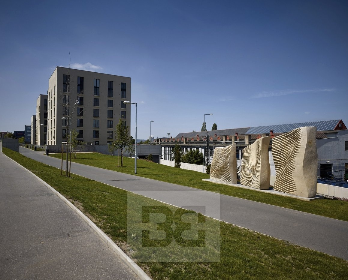 Novostavby domů přiléhají kratšími fasádami k ulici Novovysočanská, vůči které se vymezují průběžnou betonovou opěrnou zdí. Domy jsou oproti stávající ulici posazené o úroveň níž, a díky tomu kolem sebe vytváří pobytové veřejné prostředí v městské zeleni, kterému dominuje abstraktní pískovcová skulptura na motivy tří rozevlátých ženských těl od sochaře Petra Váni.