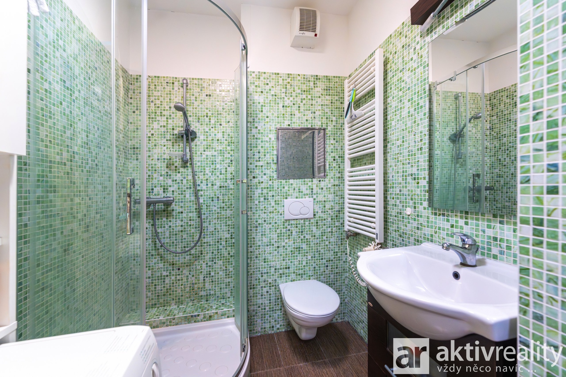 Interiér je účelně zařízen. Kuchyňská linka je vybavena lednicí, mikrovlnnou i elektrickou troubou, sklokeramickou deskou s odsáváním. V koupelně se nachází elegantní skleněný sprchový kout. Obytný prostor (23,5 m²) působí svěže a vzdušně díky dvěma velkým balkonovým dveřím vedoucím přímo na terasu. Praktickým prvkem jsou vestavěné skříně – jedna zrcadlová ve vstupní chodbě a druhá v obytné části. Posuvné interiérové dveře šetří prostor, zatímco bezpečnostní vstupní dveře zajišťují klid. Chodba i koupelna mají denní světlo díky stropním zrcadlovým tubusům. Topení je dálkové s konvektory zabudovanými v podlaze. Budova má energetický štítek třídy C, což znamená nízké provozní náklady. Měsíční poplatky do SVJ jsou aktuálně 2.900,- Kč.