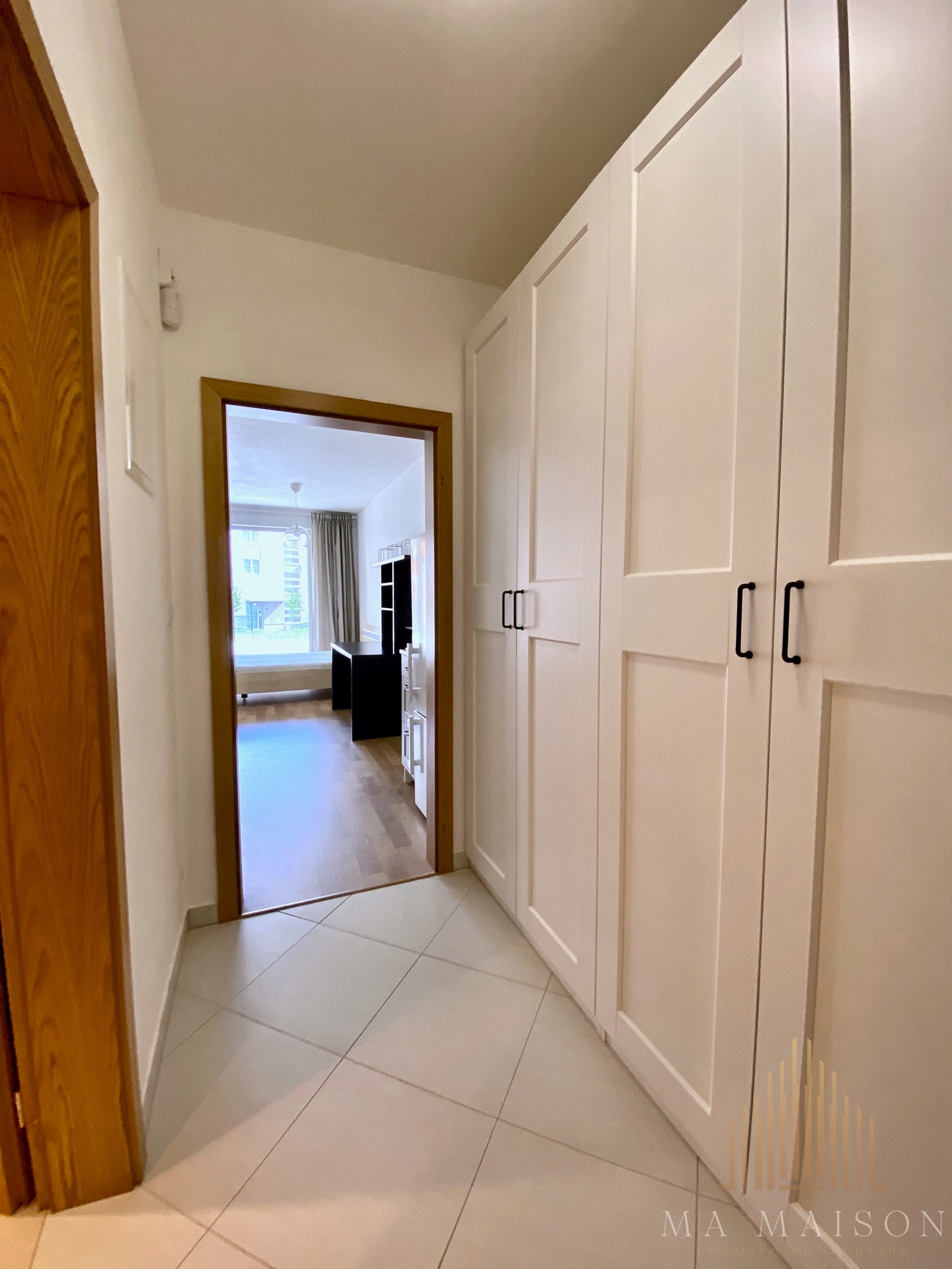 Z chodby je vstup do koupelny, kde se nachází sprchový kout, toaleta a pračka. Byt se prodává kompletně vybavený – k dispozici jsou vestavěné šatní skříně v chodbě, v obytné části manželská postel, pracovní stůl a nástěnné police. Byt je orientován do klidného vnitrobloku.