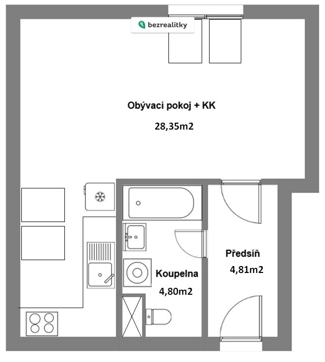 Prodej pěkného atypického bytu 1 + KK o užitné ploše 37,77m2 + velký sklep o ploše 5,6m2. Celková plocha 43,37m2.