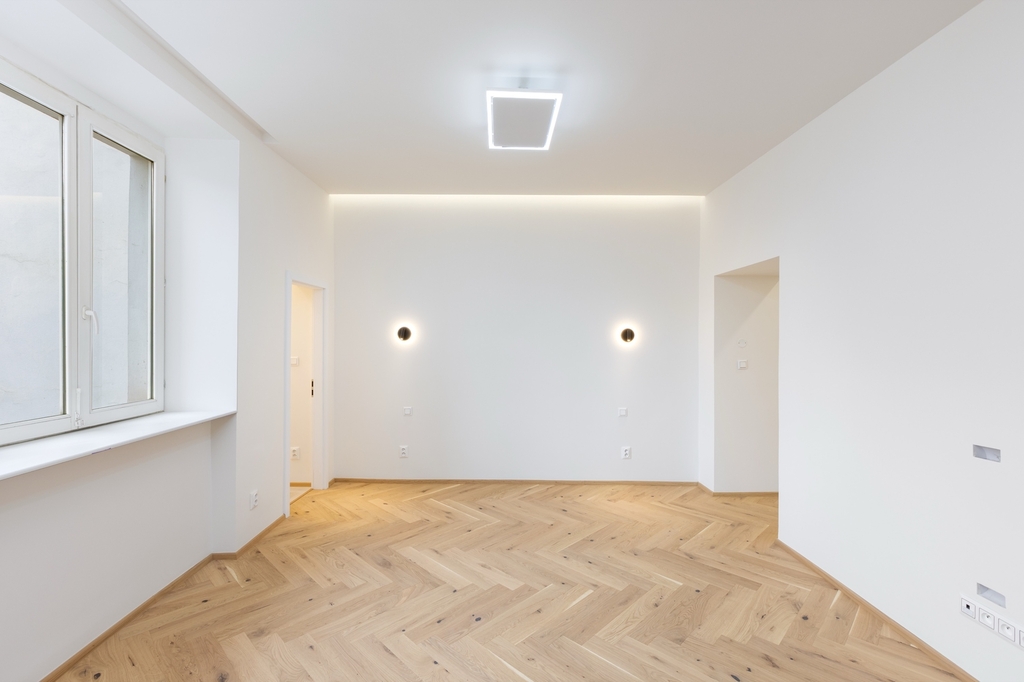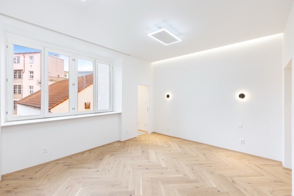 Byt má vysoké stropy, což poskytuje možnost vestavění patra na spaní a rozšíření užitného prostoru.