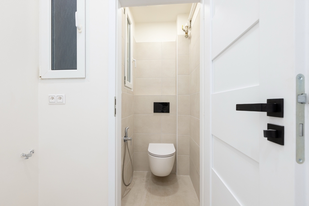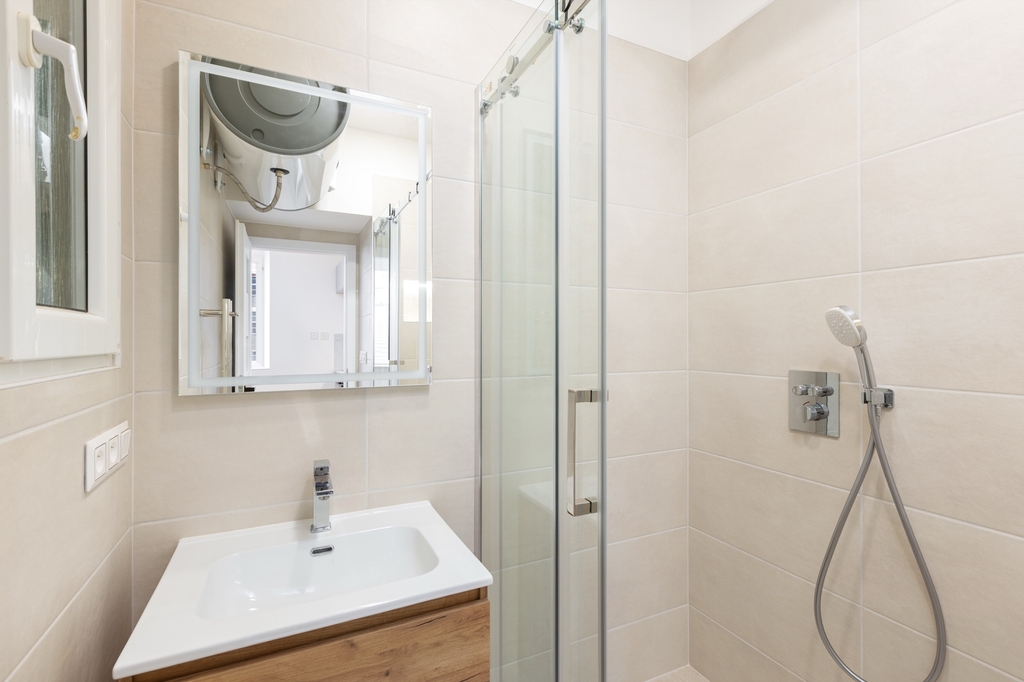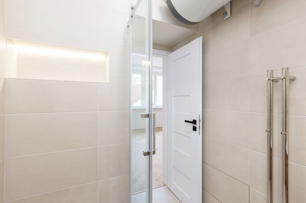 Koupelna nabízí nadstandardně prostorný sprchový koutem s osvětlenou nikou. Toaleta je oddělena.