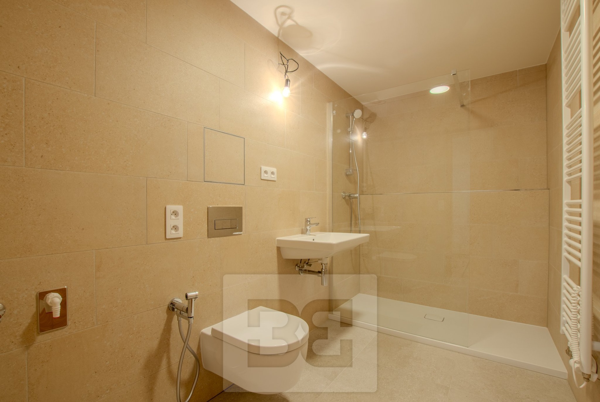 Byt je orientovaný na západ a nabízí příjemnou atmosféru i dostatek denního světla. Dispozice zahrnuje obývací pokoj s moderně vybavenou kuchyňskou linkou (lednice, myčka, trouba, indukční varná deska a digestoř), prostorná s a koupelnu se sprchovým koutem a toaletou. V koupelně najdeme dále i bidetovou sprchu, topný žebřík a prostor na pračku a sušičku. K bytu náleží i sklepní kóje o výměře 1,8m2.