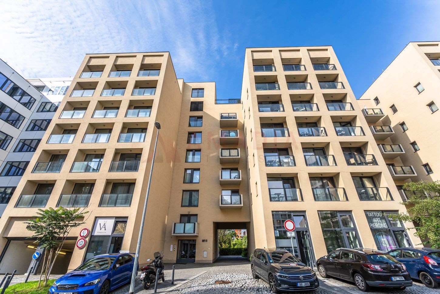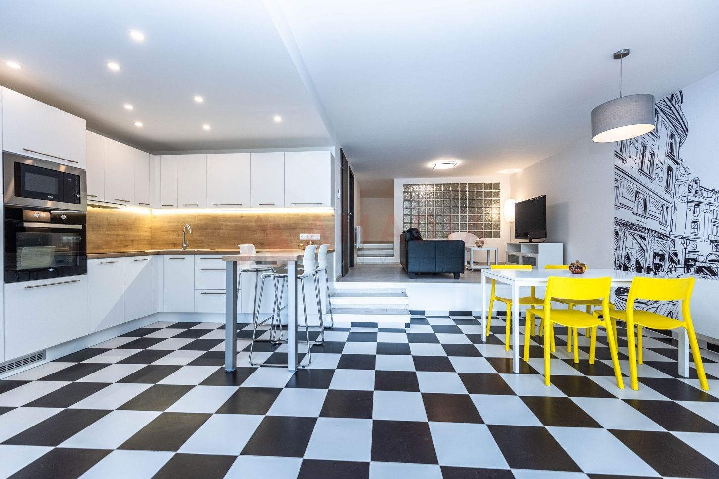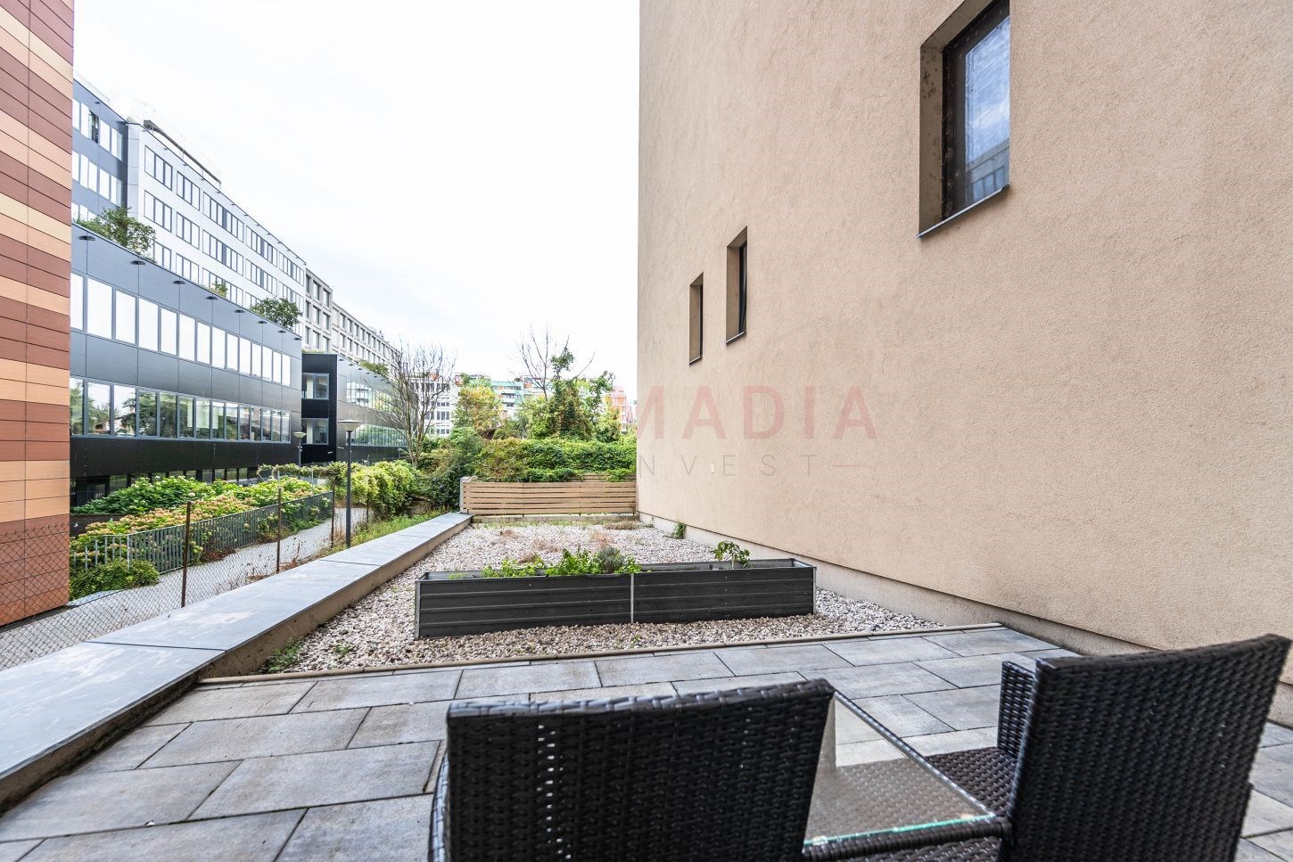 Byt je kompletně zařízen kvalitním nábytkem a nabízí komfortní bydlení: plovoucí podlahy a dlažba, hliníková francouzská okna s předokenními žaluziemi, domácí videovrátný.