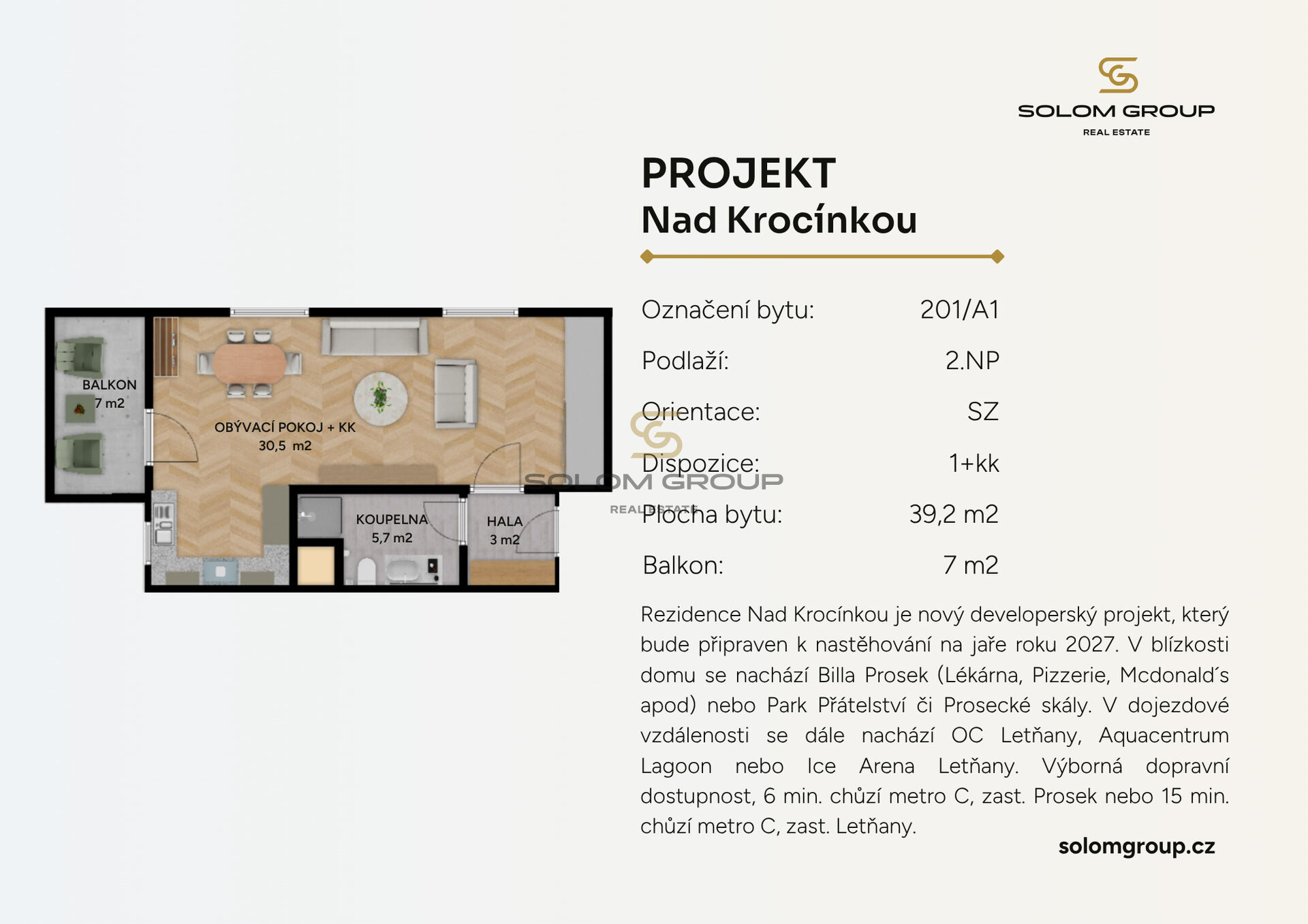 Prodej nového rohového bytu 1+kk, 46,2 m² (byt o výměře 39,2 m² + balkon o výměře 7 m²), který se nachází ve 2. NP cihlové novostavby v Rezidenci Nad Krocínkou III, Praha 9 – Prosek.