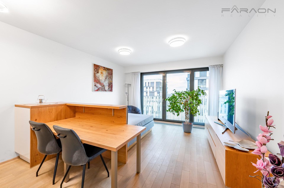Dispozici bytu 1+kk tvoří otevřený prostor obývací části s jídelním prostorem a kuchyní v bílém lesklém designu v kombinaci s dřevem, s působivými prosklenými francouzskými okny a výhledy na panorama Prahy, dále prostorná koupelna se sprchovým koutem, samostatná závěsná toaleta zvlášť, vstupní hala se zabudovanými šatními skříněmi. Veškerý nábytek je dělaný na míru, v ložnici je značková prostorná postel z masivu s kvalitní matrací. Dostatek úložných prostor je i ve sklepě, kde je na míru vybudovaný policový systém.
