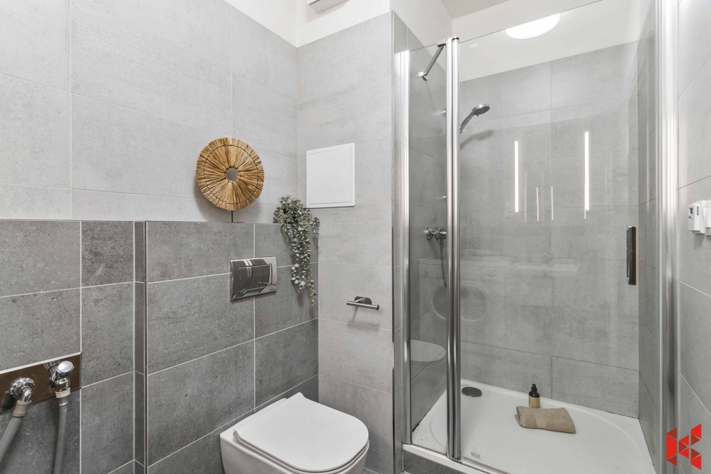 ✔ Prostornou koupenou se sprchovým koutem, místem pro pračku a WC