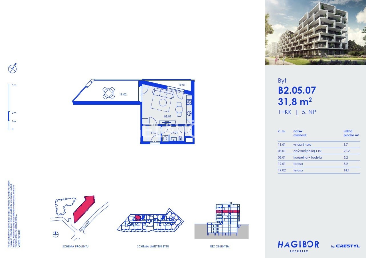 Byt o užitné ploše 31,5 m² je situován v 5. nadzemním podlaží (4. patro) domu s výtahem. K jednotce náleží dvě terasy o velikosti 14,4 m² a 3,6 m² orientované na sever a západ do klidného vnitrobloku a dále sklepní kóje o velikosti 4,8 m².