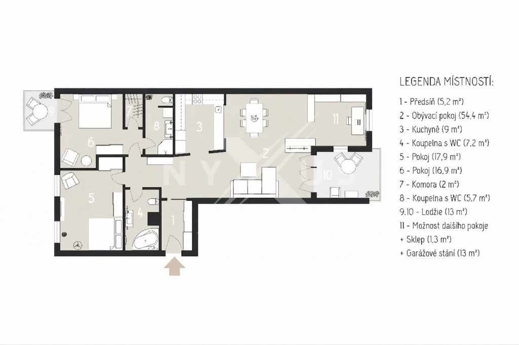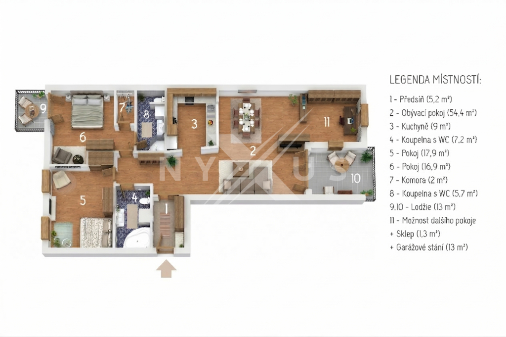 Dispozice 3+kk s možností jednoduché úpravy na 4+kk (více ve videu a půdorysu) dává budoucímu majiteli svobodu přizpůsobit si byt podle vlastních potřeb. Užitná plocha 118,3 m² + sklep 1,3 m², dvě kryté lodžie 13 m². K tomu dvě koupelny včetně dvou toalet, komora v bytě. Obývací část je orientována na jihovýchod, pokoje na severozápad.