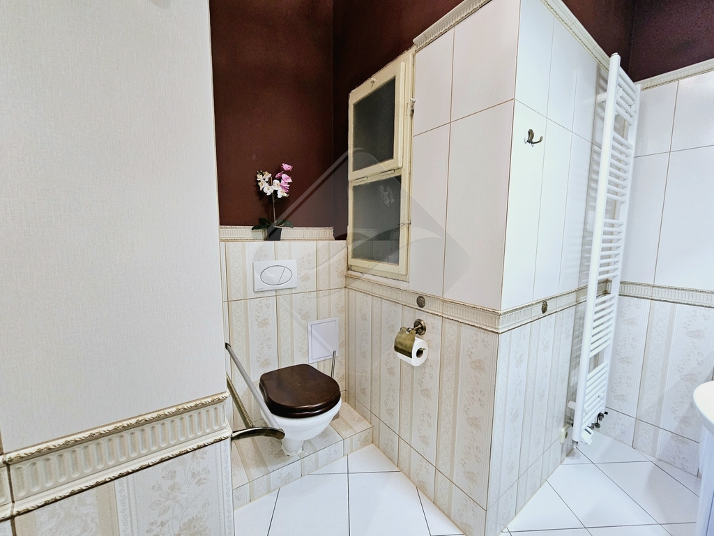 Koupelna (5 m²) se sprchovým koutem, WC, podlahovým topením a topným žebříkem.