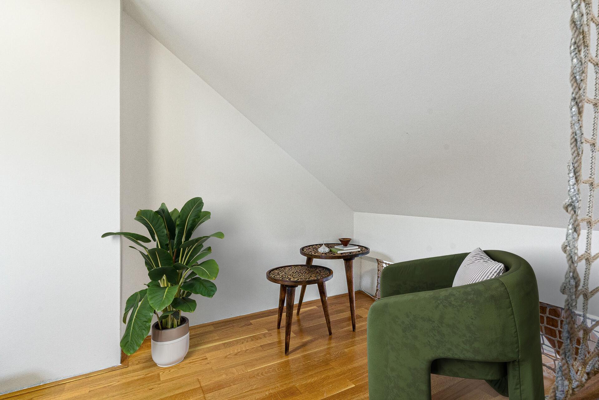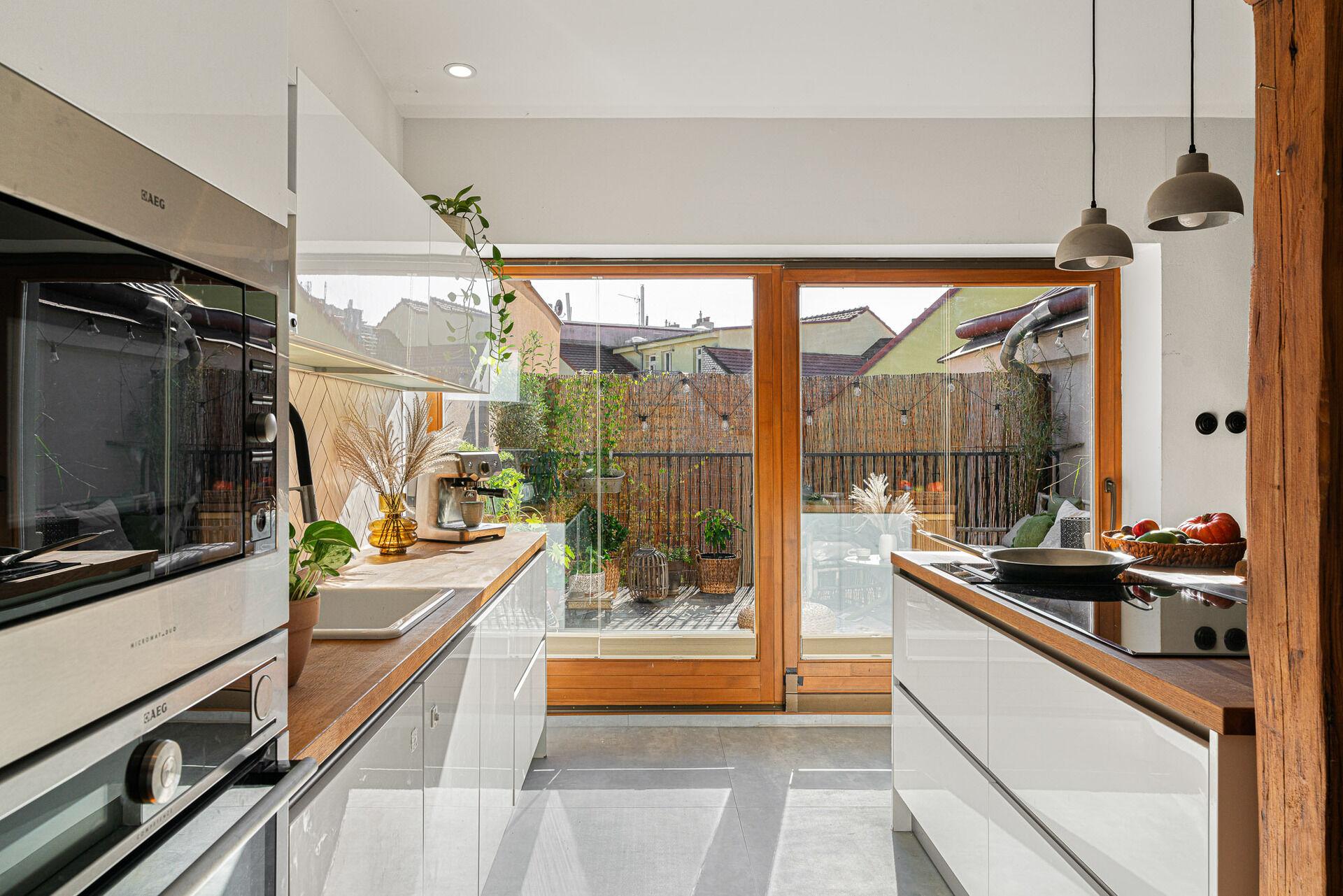 Otevřený obývací pokoj s kuchyňským ostrůvkem je centrem dění – a když budete vařit, stačí se otočit a jste na terase. Zajímavým prvkem je vestavěné patro, kde můžete spát doslova pod oblohou, s výhledem na hvězdy skrz střešní okno. Druhá, samostatná ložnice s výhledem na panorama Nuselského mostu nabízí dostatek soukromí a chytré vestavěné řešení úložného prostoru.