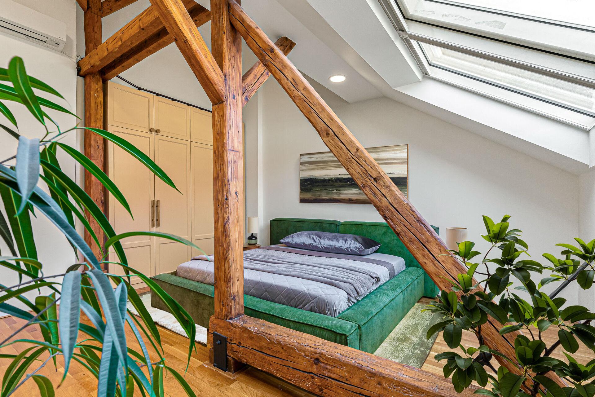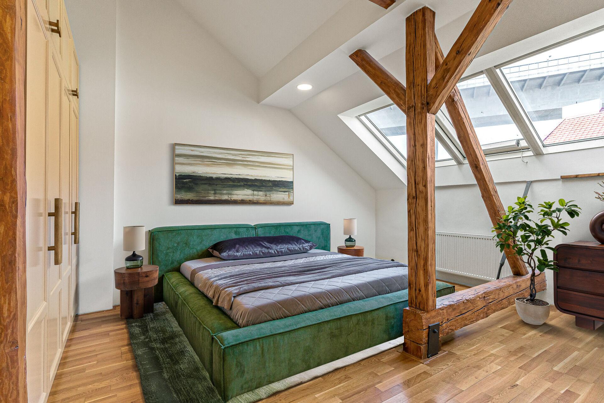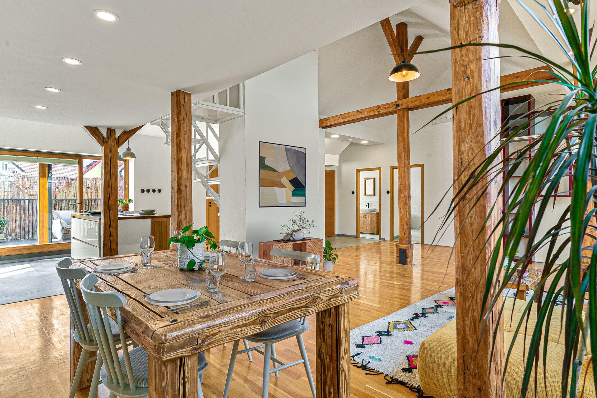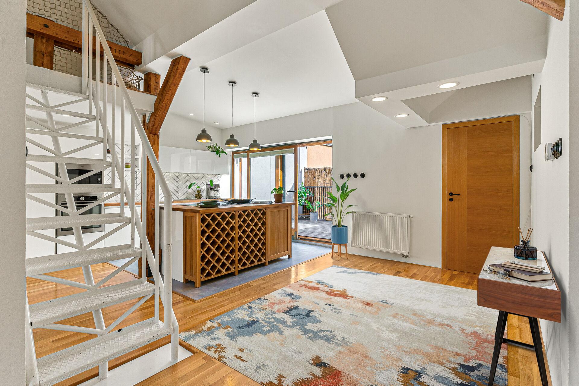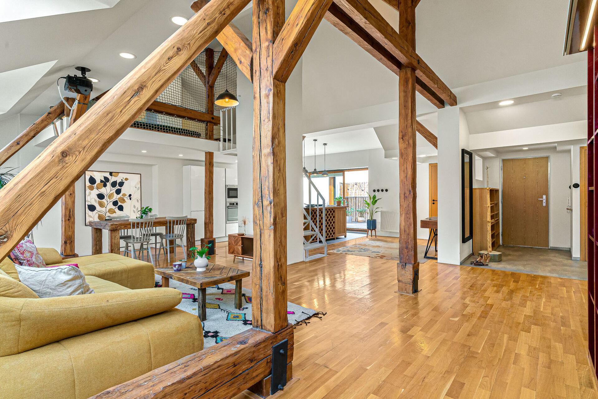 Vstoupíte – a okamžitě víte, že tento byt je jiný. Vysoké stropy, masivní trámy a světlo proudící střešními okny vytvářejí jedinečný prostor s duší. Když k tomu přidáte soukromou terasu, je jasné, že tohle je bydlení, které se nevidí každý den.