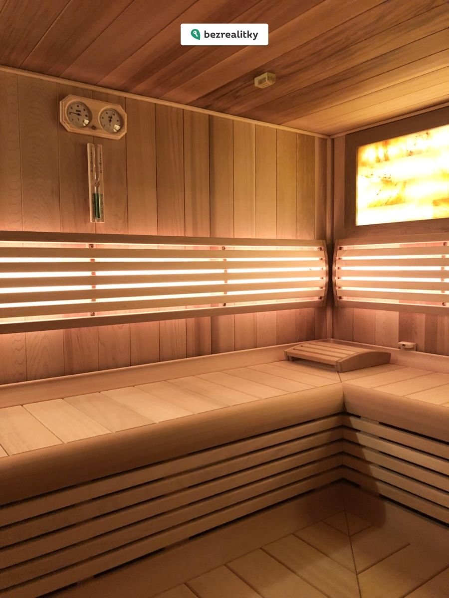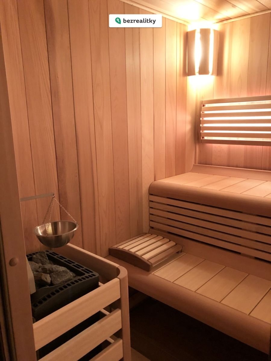 - Spodní podlaží nabízí relaxační zónu s profesionální saunou pro 6 osob (solný panel), sprchu, samostatné WC, prádelnu, úklidovou místnost a sklad. Prostor lze využít také jako ateliér, domácí pracovnu či studio.