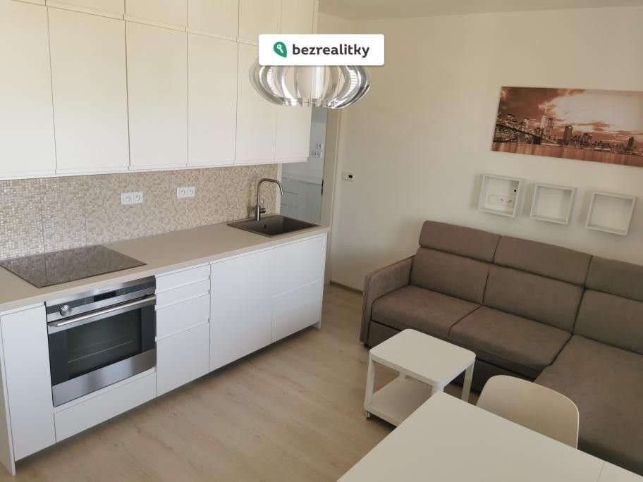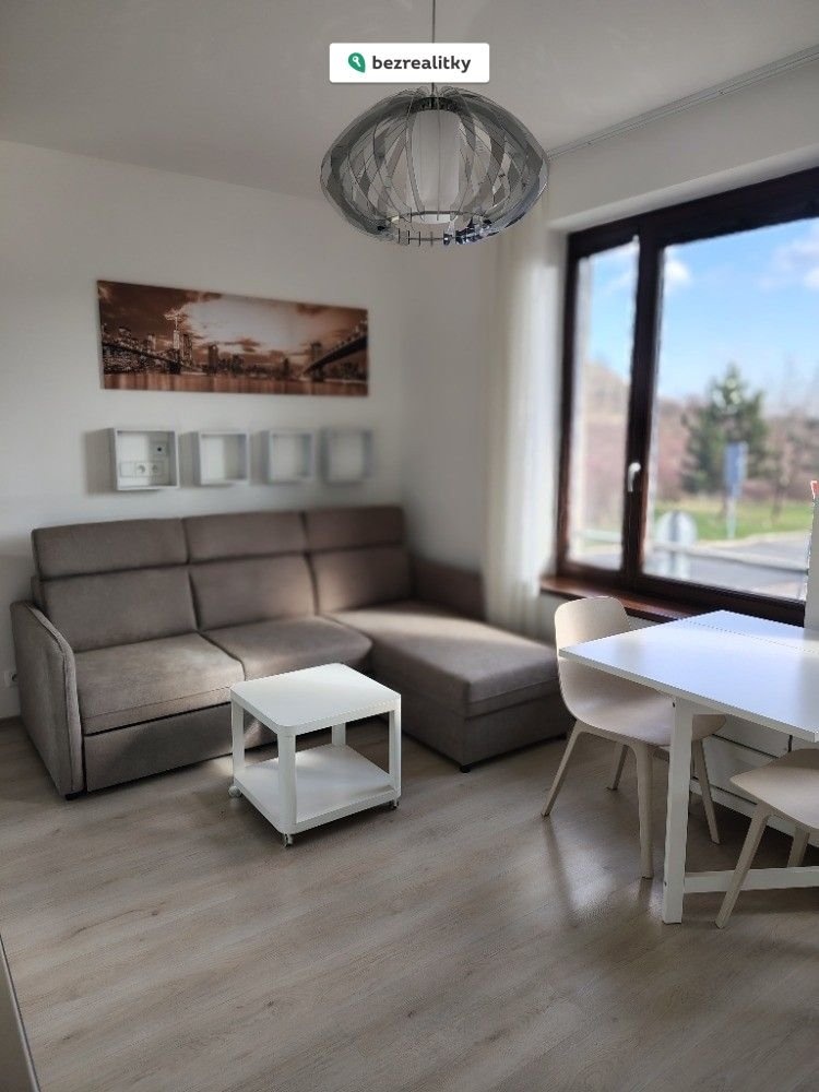 Z předsíně vedou dveře do prostorné koupelny s bezbariérový sprchovým koutem a WC, další dveře vedou do prostorné obývací místnosti s kuchyňskou linkou a vestavnou skříní.