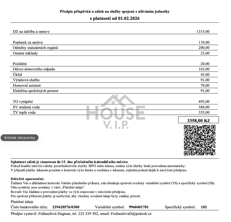 Měsíční poplatky činí cca 3 500 Kč pro dvě osoby + elektřina. SVJ (617) je dobře fungující a zajišťuje bezproblémový chod domu. Byt je aktuálně prázdný a připravený k okamžitému nastěhování.