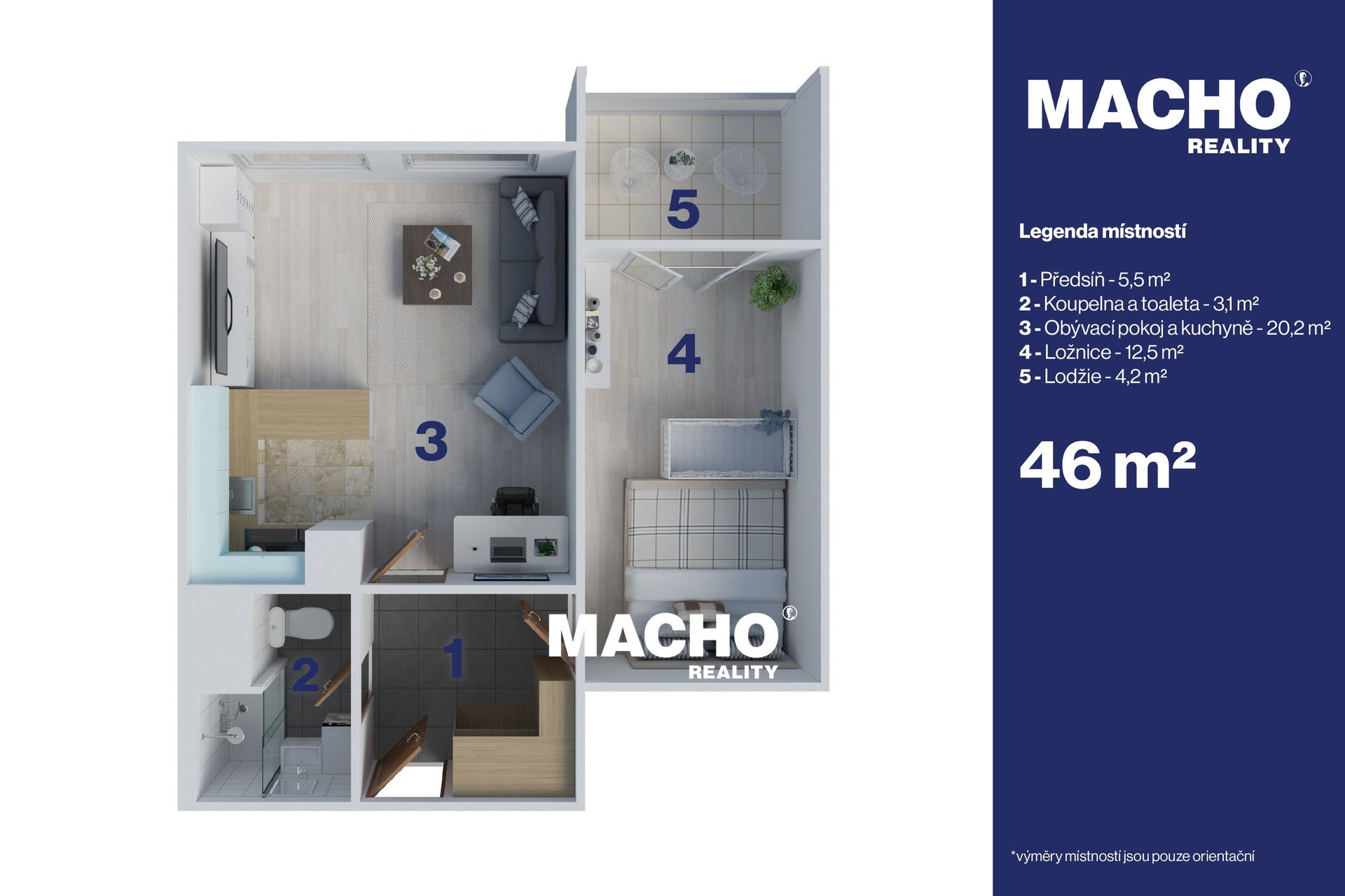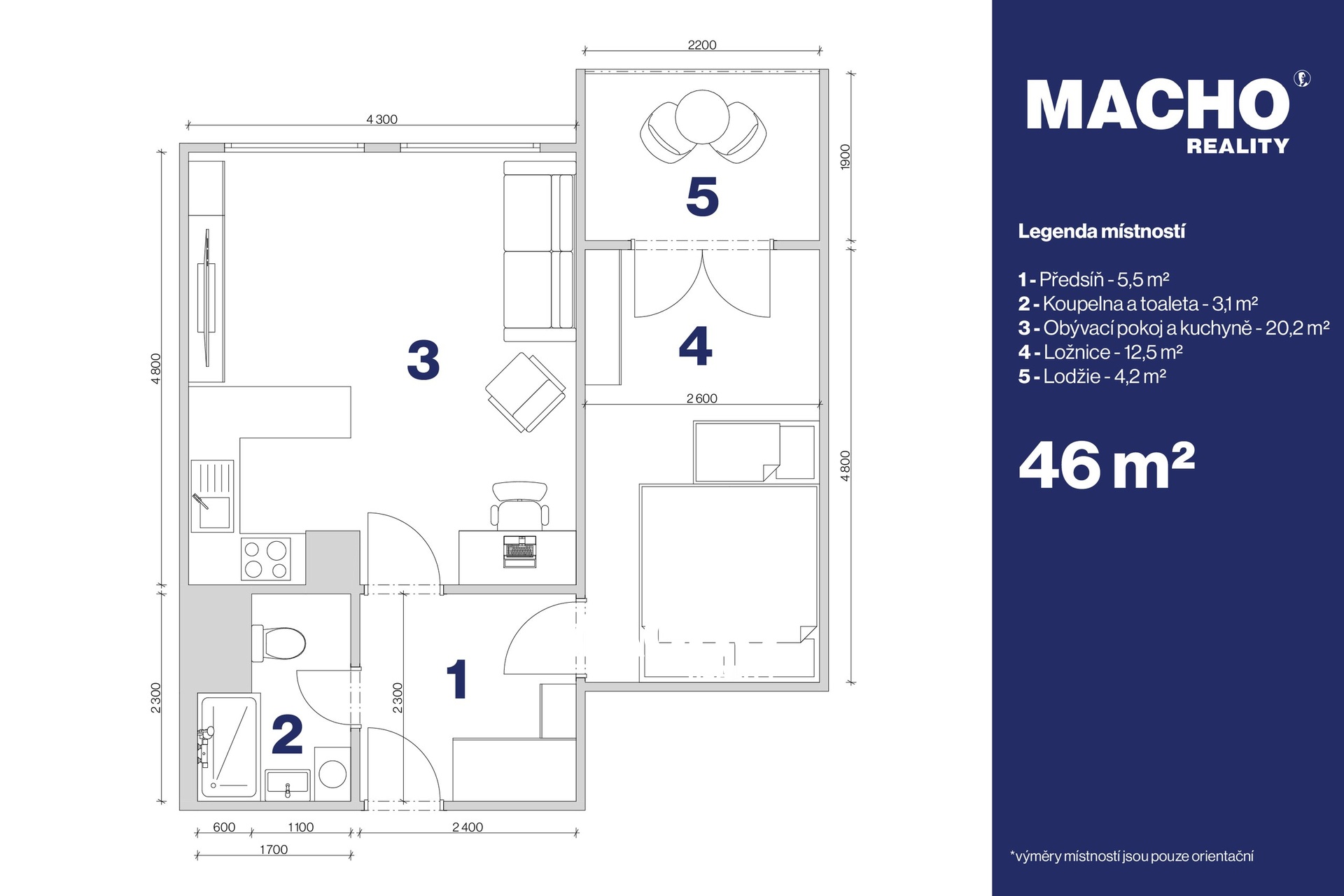 Celková podlahová plocha bytu, včetně příslušenství, činí velkorysých 46 m². Samotná podlahová plocha bytové jednotky je 41,8 m², přičemž ji příjemně rozšiřuje zasklená lodžie o výměře 4,2 m² — ideální místo pro relaxaci a odpočinek v soukromí po celý rok.