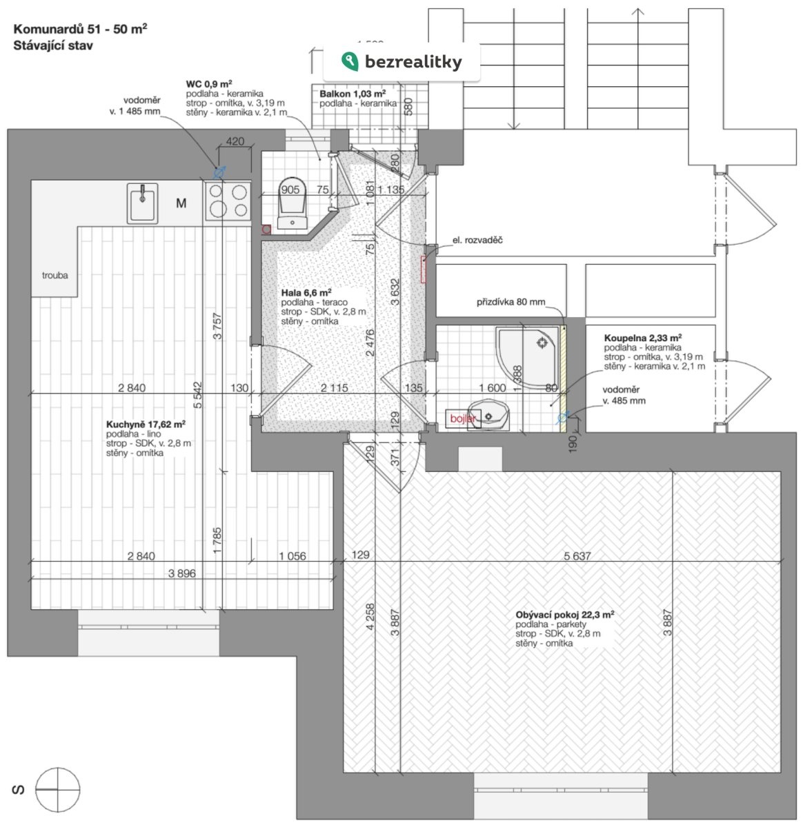 Byt je velmi světlý. Obě obytné místnosti směřují do klidného vnitrobloku se západní orientací. Je po nedávné rekonstrukci (omítky, elektro, kuchyně, okna…) a je možné jeho okamžité užívání. Výšky a rozměry místností, návaznosti dispozice a povrchy jsou popsány v přiložených půdorysech. V obývacím pokoji jsou původní parkety v dobrém stavu. V chodbě je původní teraco, které by chtělo zrenovovat. V kuchyni je stávající linoleum na DTD velkoplošných deskách, které s největší pravděpodobností překrývají původní parkety nebo podlahová prkna - sonda nebyla provedena. Dispozičně je možné přemístit kuchyni do větší obytné místnosti s napojením odpadů a vody do koupelny. Společné prostory domu jsou udržované a čisté s původními povrchy a detaily.