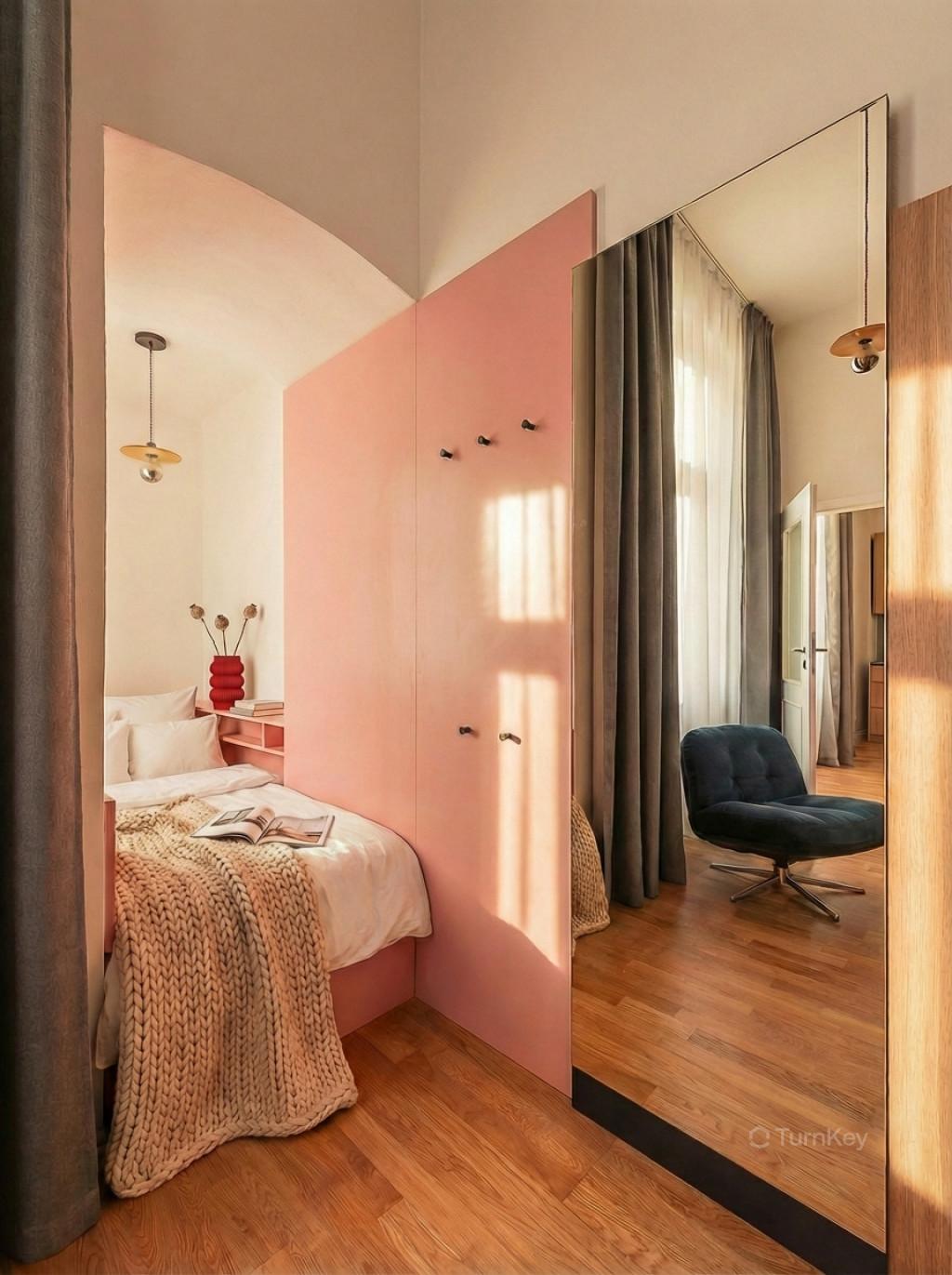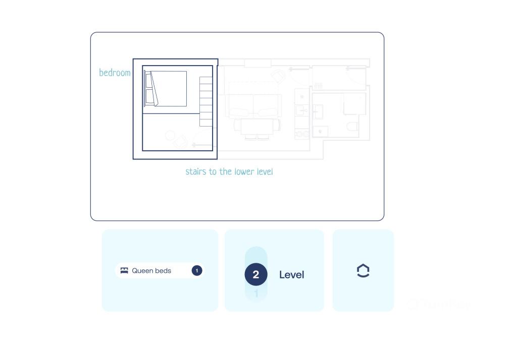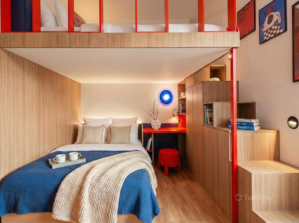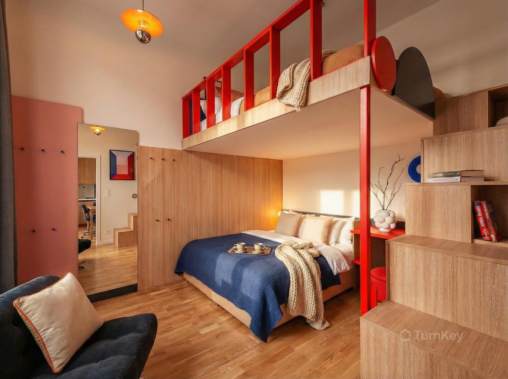 Vysoké stropy cca 4 m dodávají interiéru otevřený a světlý charakter. Vestavěné patro rozšiřuje obytný prostor a umožňuje efektivní využití dispozice, což ocení zejména krátkodobé pronájmy s vyšší obsazeností.