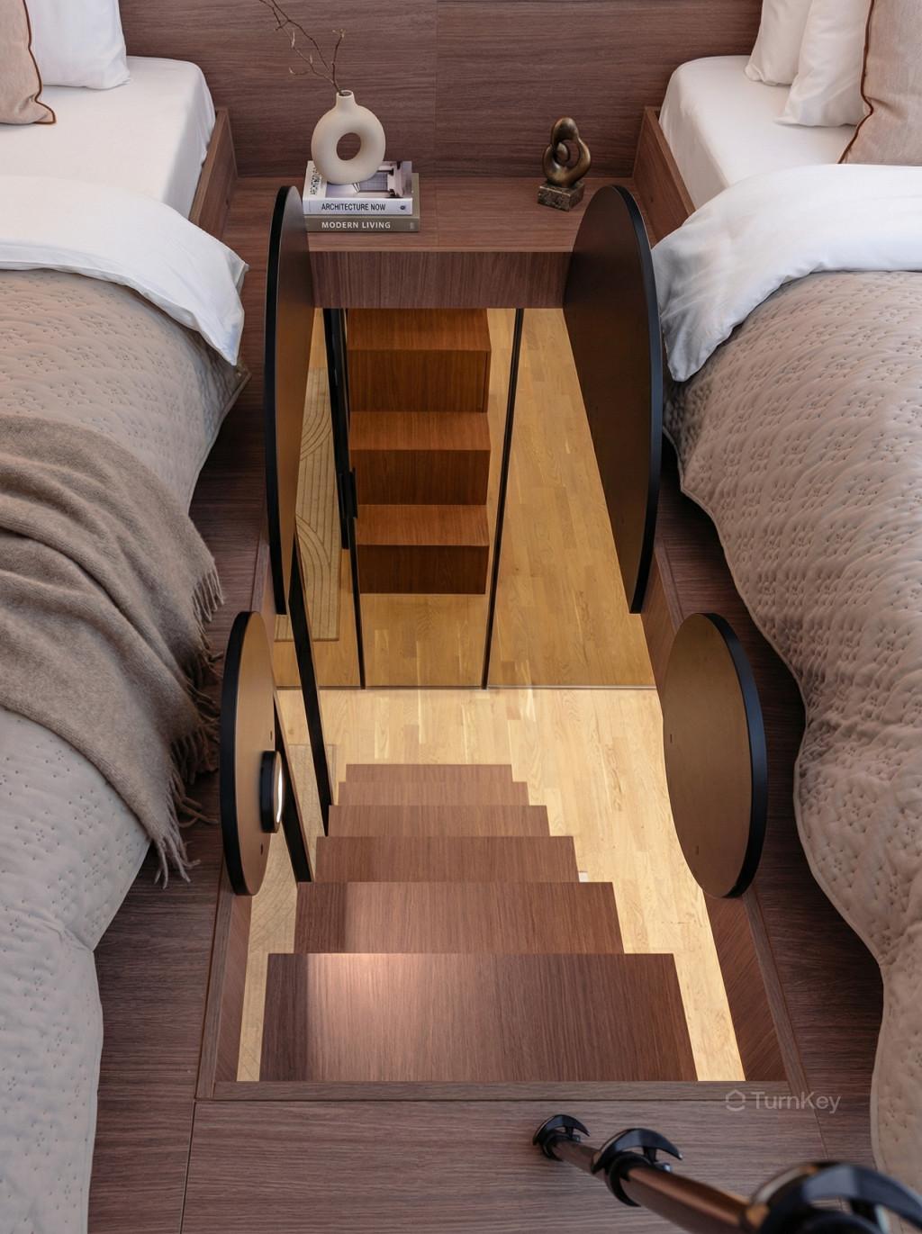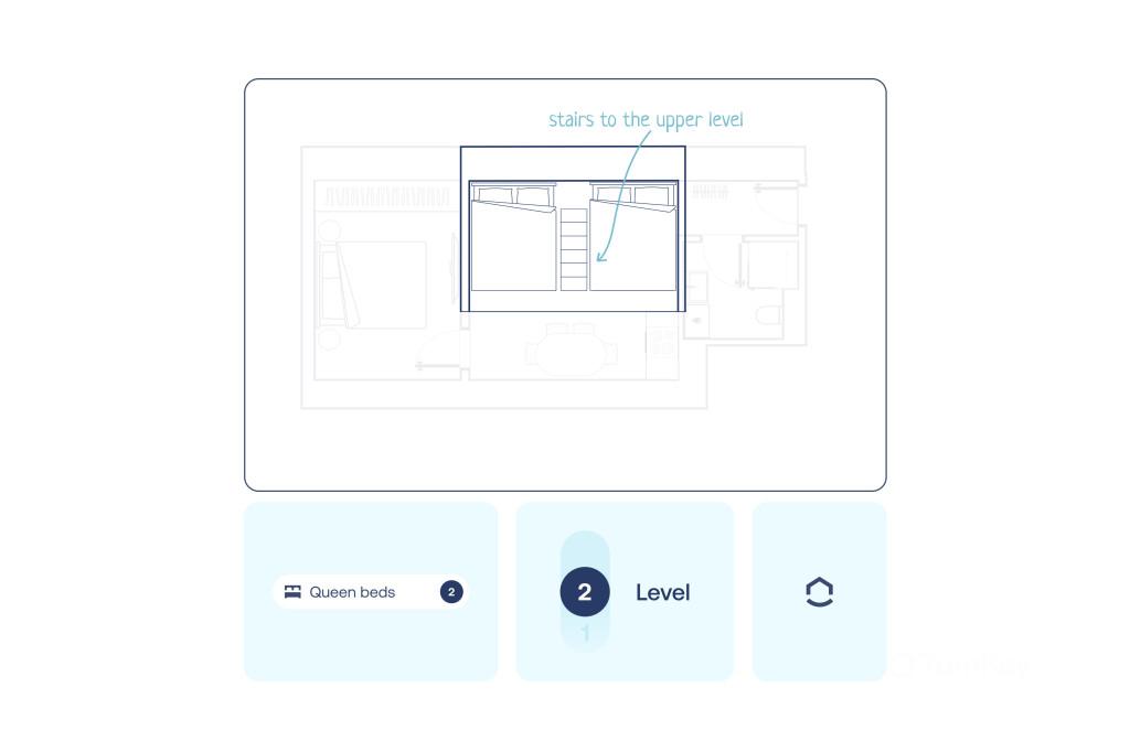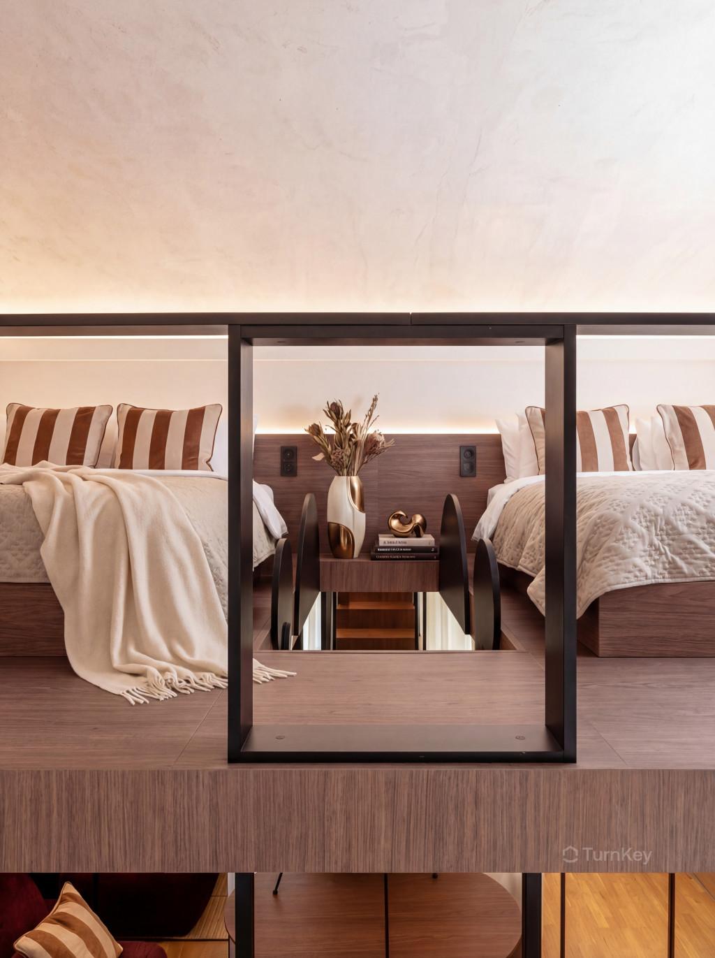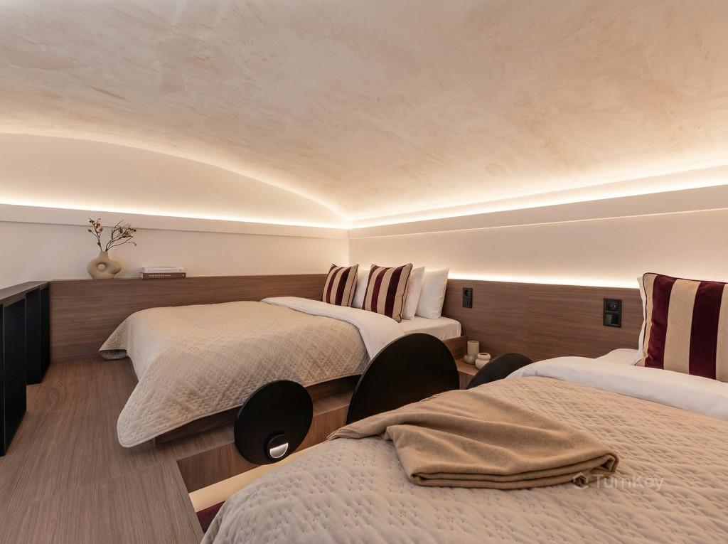 Stropy o výšce přibližně 3,5 m vytvářejí vzdušný a světlý prostor. Vestavěné patro rozšiřuje obytnou plochu a umožňuje efektivní rozdělení prostoru, což je výhodné zejména při krátkodobém pronájmu s vyšší kapacitou hostů.