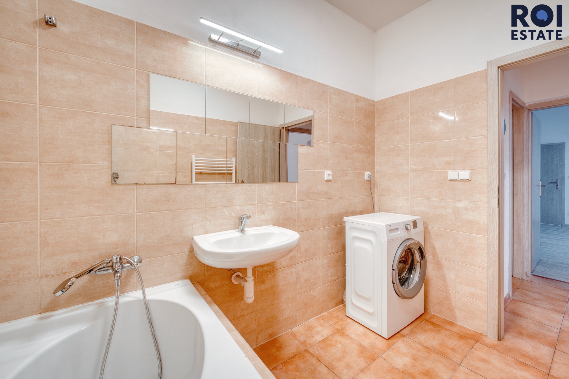 Byt nabízí prostorný obývací pokoj s kuchyňským koutem, samostatnou ložnici, koupelnu s vanou a samostatné WC. Kuchyňská linka je vybavena základními spotřebiči (sporák, trouba, lednice). Koupelna disponuje vanou, umyvadlem a pračkou.