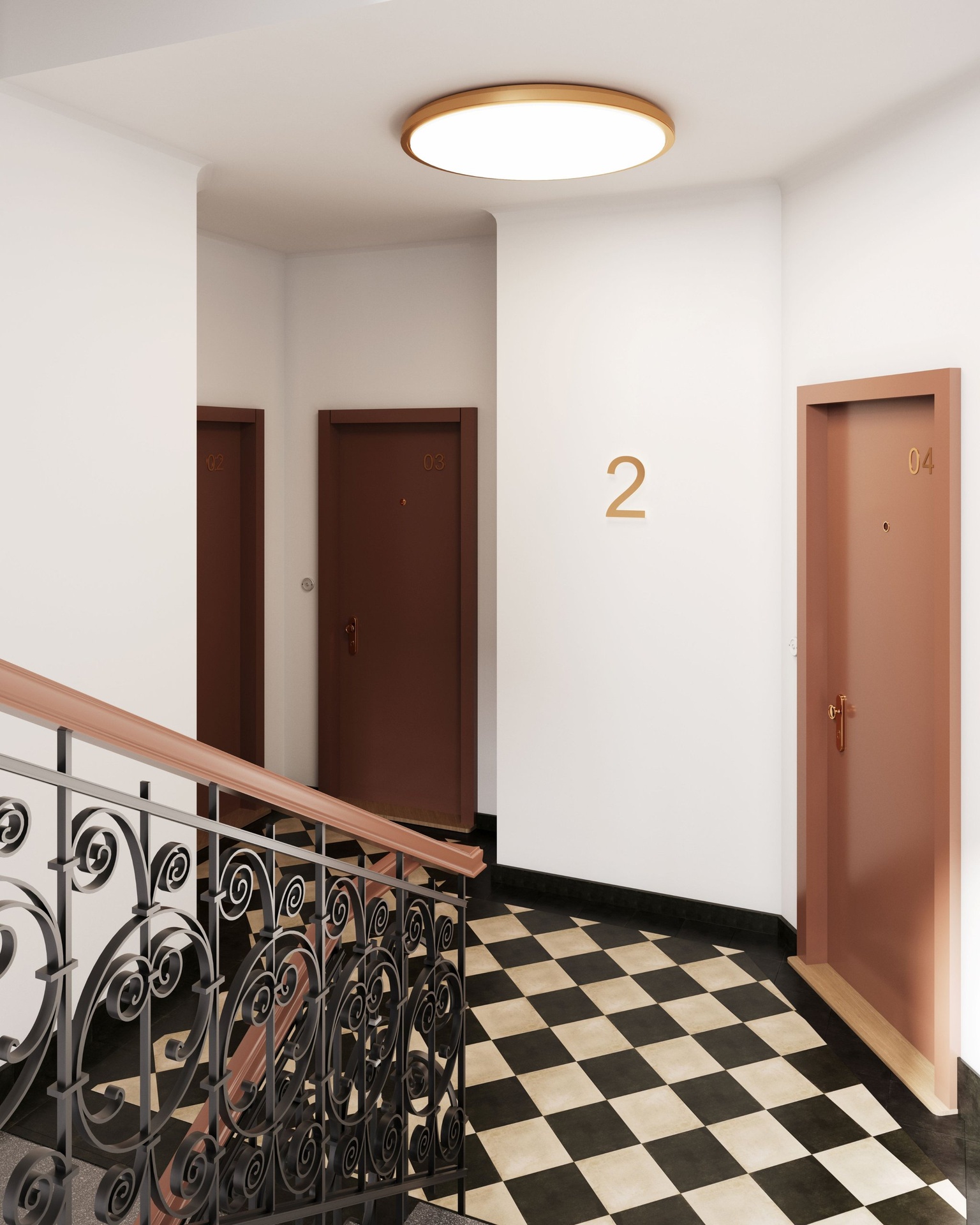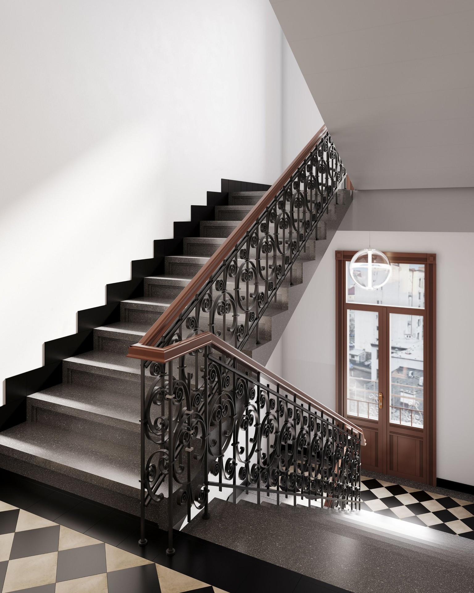 Dispozice bytu v 5. nadzemním podlaží nabídne obývací pokoj s přípravou na kuchyň, ložnici, samostatný pokoj, koupelnu, samostatné WC, komoru a předsíň. K jednotce patří i sklepní kóje. Byt se prodává v původním stavu před rekonstrukcí – bez finálních povrchů, vybavení či kuchyňské linky. Nový majitel tak získá možnost navrhnout si interiér zcela podle vlastního vkusu a potřeb. Dům prochází kompletní obnovou společných prostor. Součástí revitalizace je opravená historická fasáda, nová vstupní hala s bezpečnostními dveřmi, renovované schodiště s původním zábradlím, nové elektroinstalace ve společných prostorách i technické zázemí. Vznikne také kolárna, sklepní prostory a odpočinková zóna ve vnitrobloku.