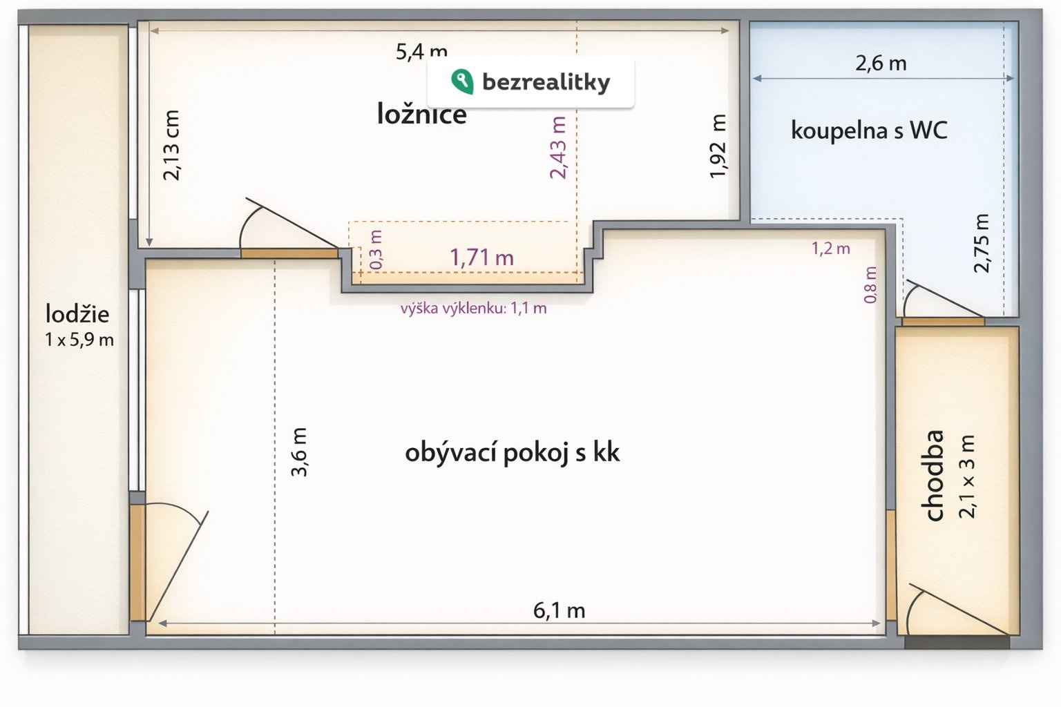 Byt o dispozici 2+kk a celkové výměře 54 m2 tvoří malá předsíň, prostorná koupelna s WC, obývací pokoj s kuchyňským koutem a posezením a ložnice. Všechna okna jsou orientována na jih, stejně tak lodžie. Součástí bytu je také sklepní kóje.