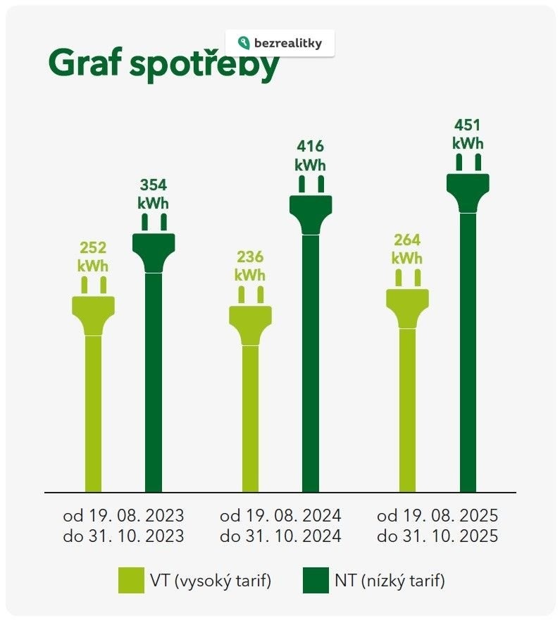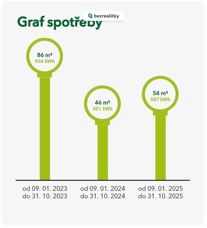Přes energetickou třídu budovy E je byt energeticky málo náročný - viz.přehledy spotřeb plynu a el.energie (současný dodavatel MND) - detailní provozní náklady za uplynulé roky zájemcům samozřejmě předložíme.