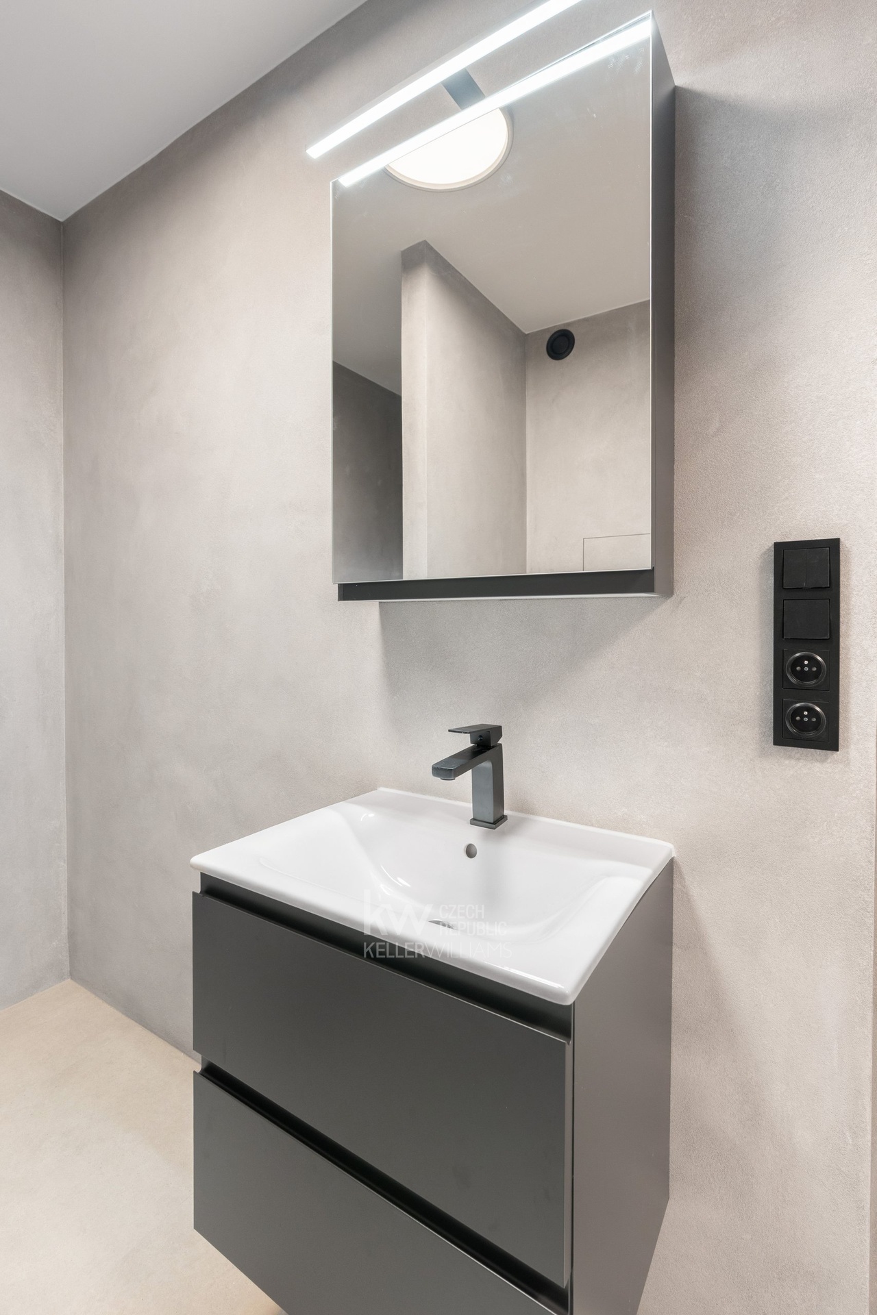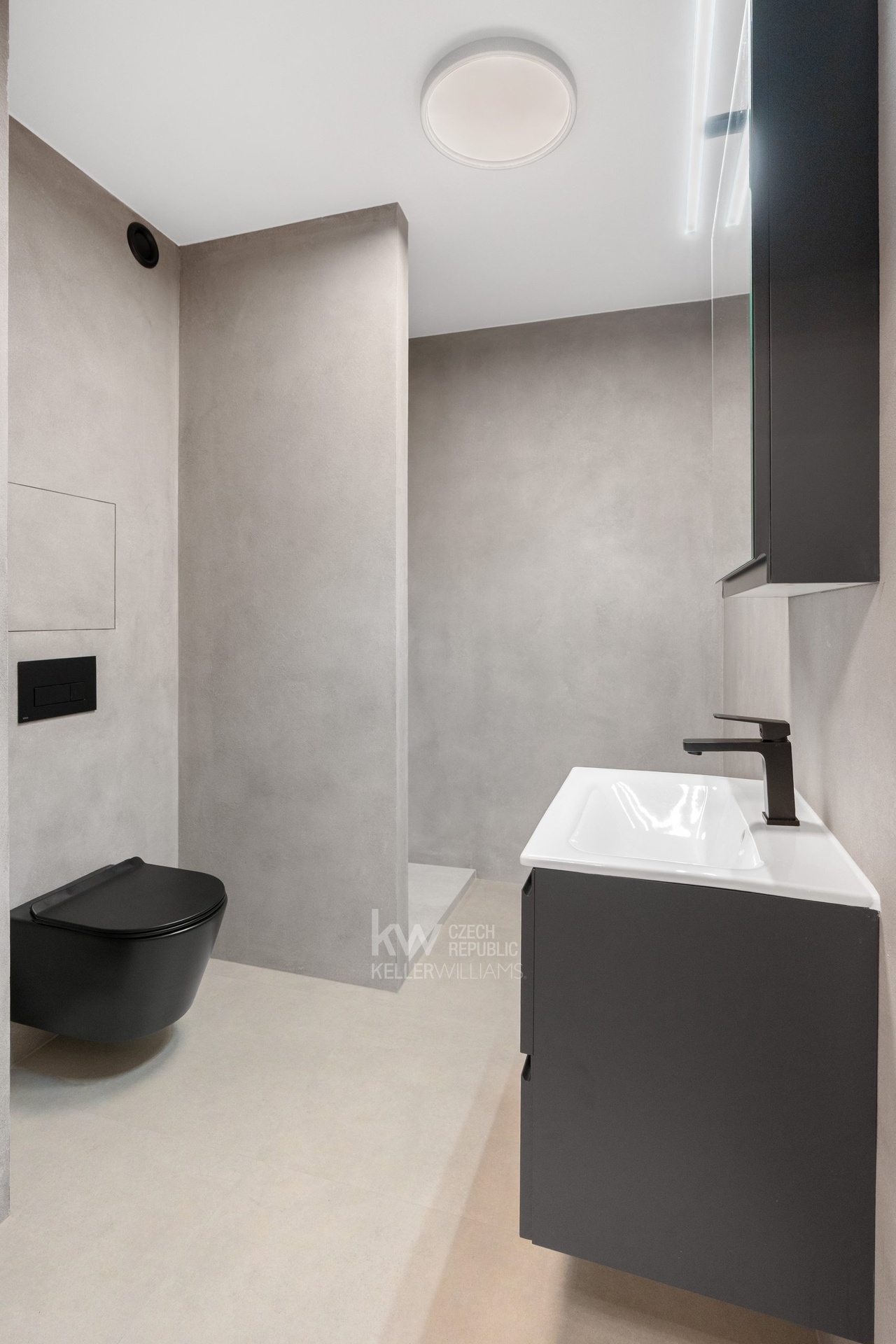 Dispozice bytu je promyšlená a funkční – kromě obývací části nabízí ložnici, prostornou samostatnou šatnu, koupelnu s toaletou a sprchovým koutem a chodbu s vestavěnou skříní. Ložnice, koupelna a obývací prostor jsou vyvedeny v omyvatelné dekorativní betonové stěrce, což dodává interiéru moderní a praktický charakter. Samozřejmostí jsou podomítkové baterie, kvalitní vinylové podlahy, pečlivě vybrané materiály a sladěné designové prvky.