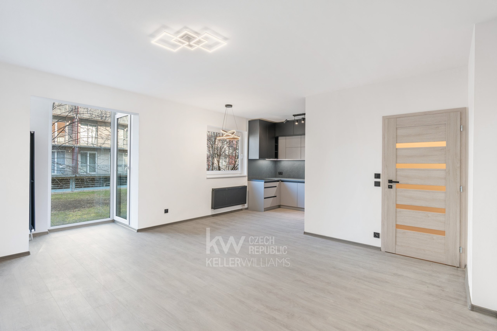 Interiér byl realizován v prémiovém standardu. Dominantou bytu je obývací prostor s kuchyňským koutem, jehož atmosféru podtrhuje velké francouzské okno, které do interiéru přivádí dostatek denního světla. Kuchyňská linka je vyrobena na míru a osazena indukční varnou deskou a prémiovými spotřebiči značky AEG.