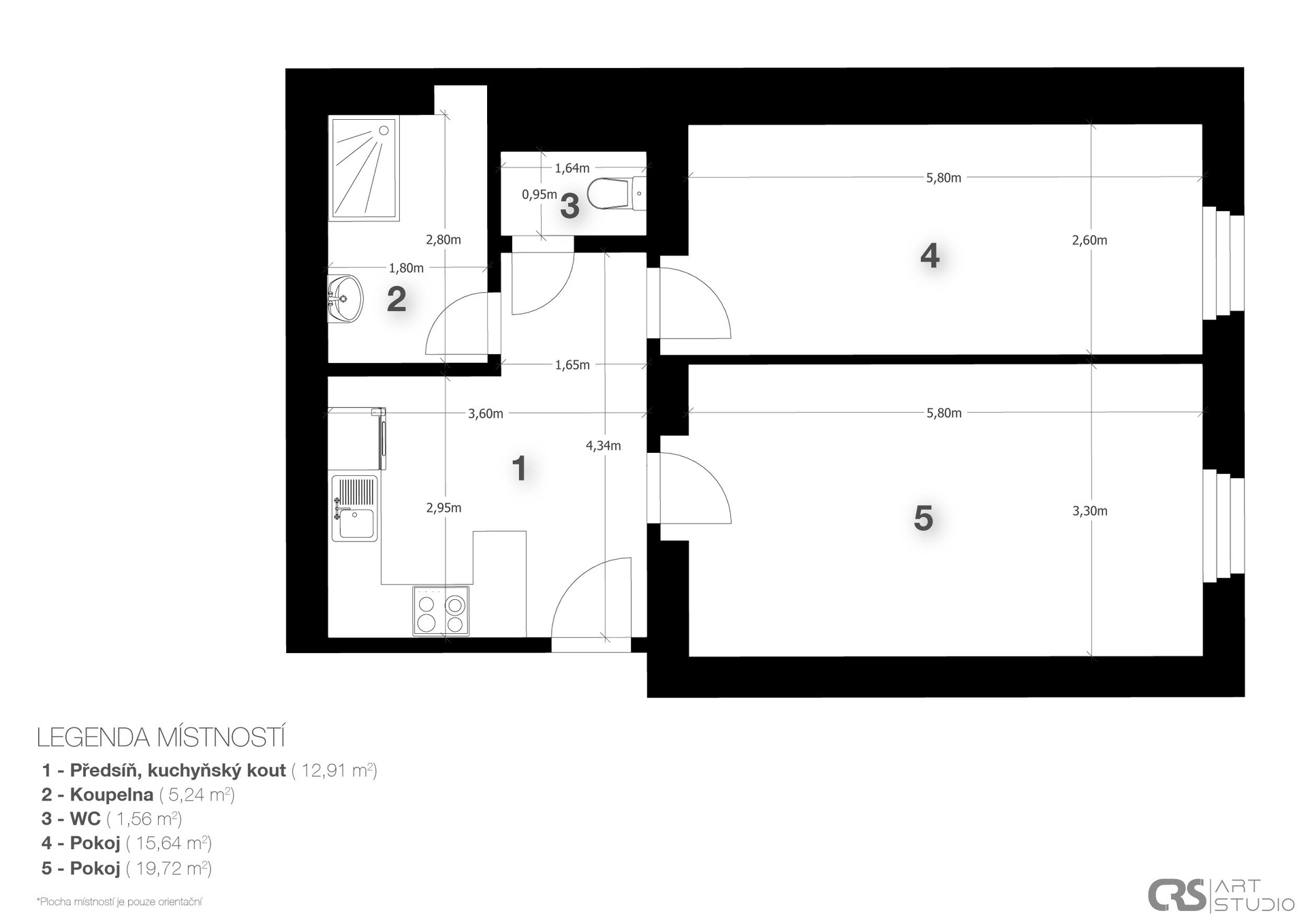 Předsíň s kuchyňským koutem (vč. myčky) – 12,9 m²