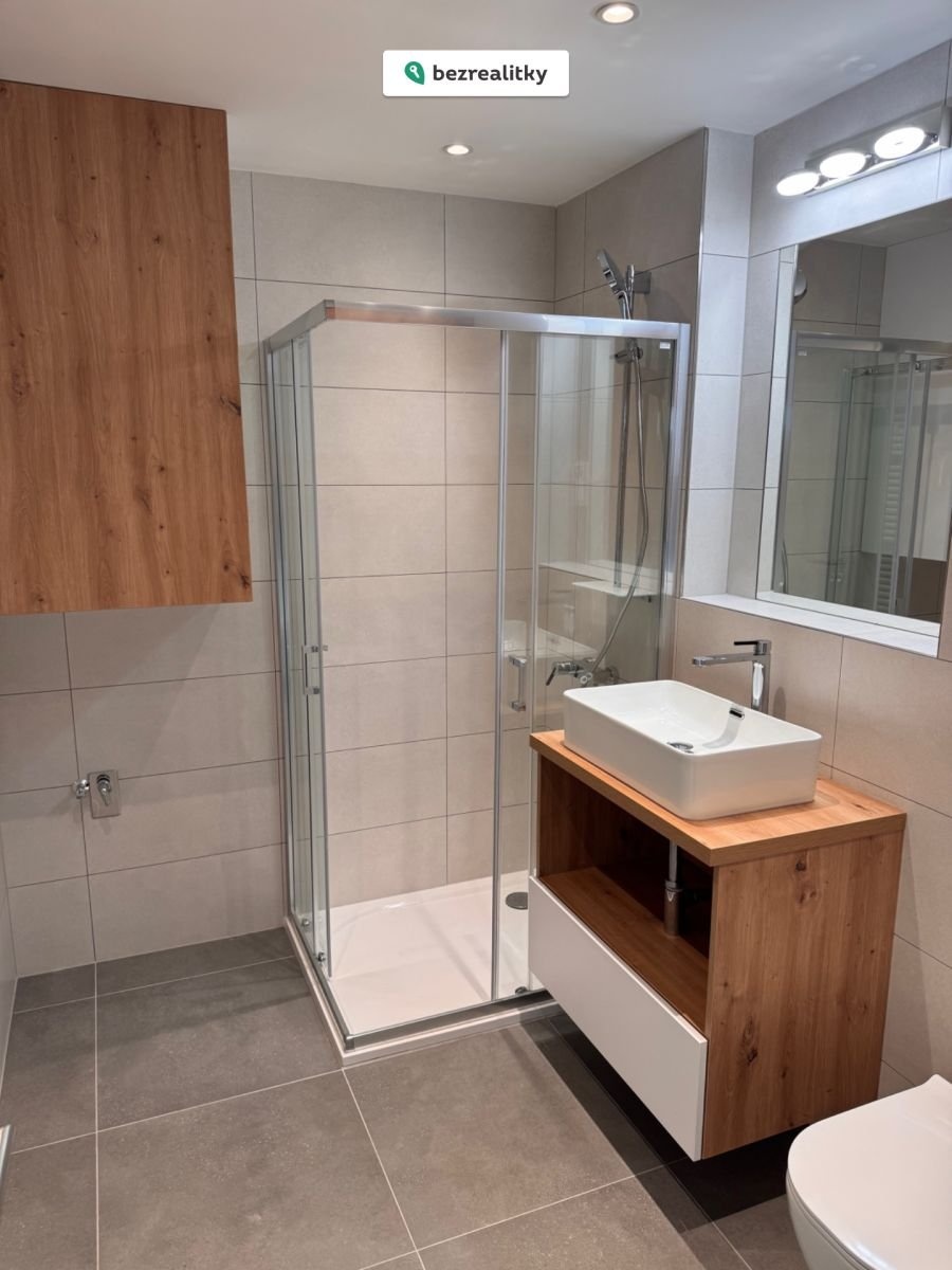 Moderní koupelna je vybavena sprchovým koutem a praktickými úložnými prostory.